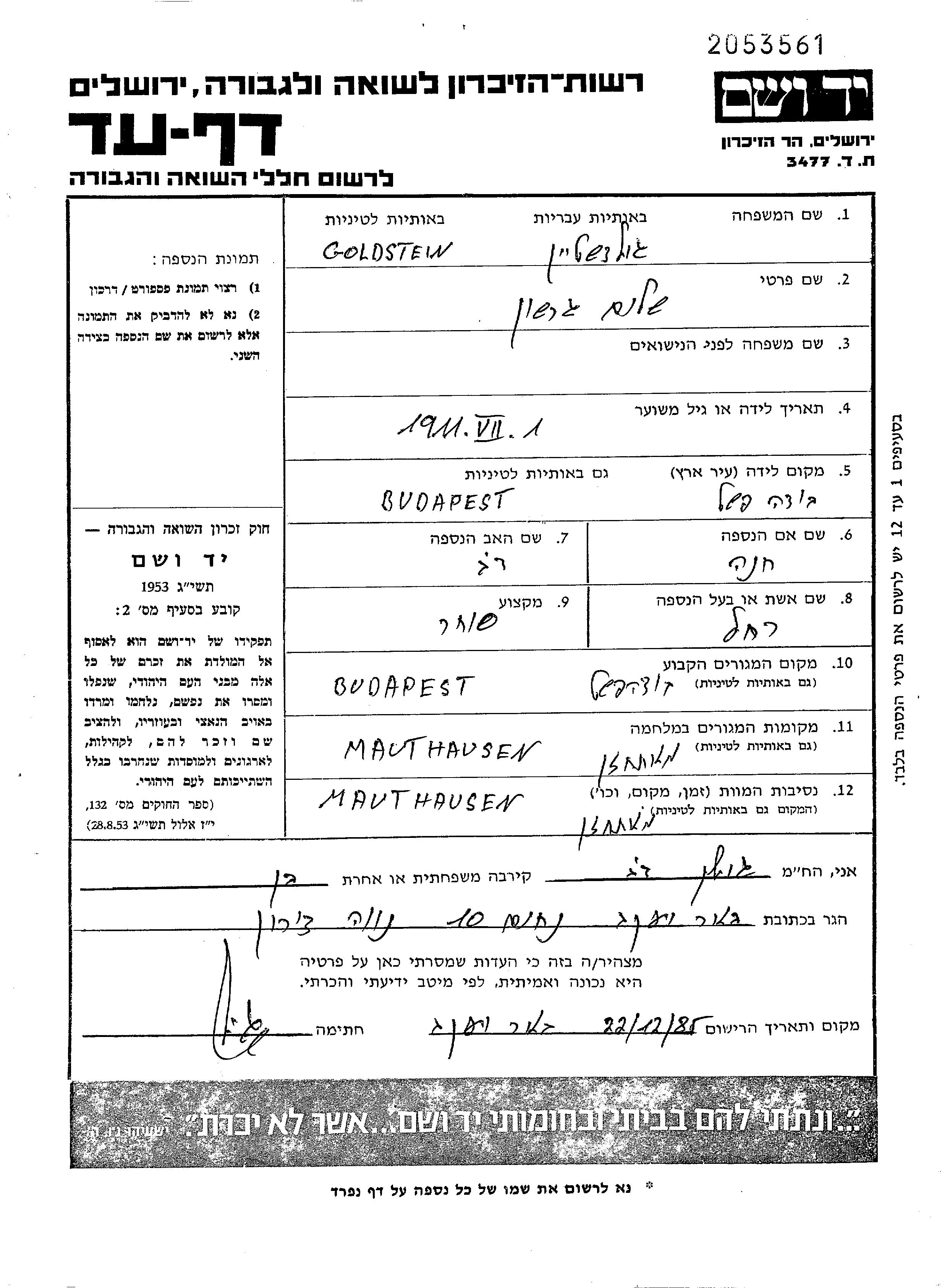 Shalom Gershon wurde in der Schoah ermordet. Todesort: Mauthausen, Österreich.