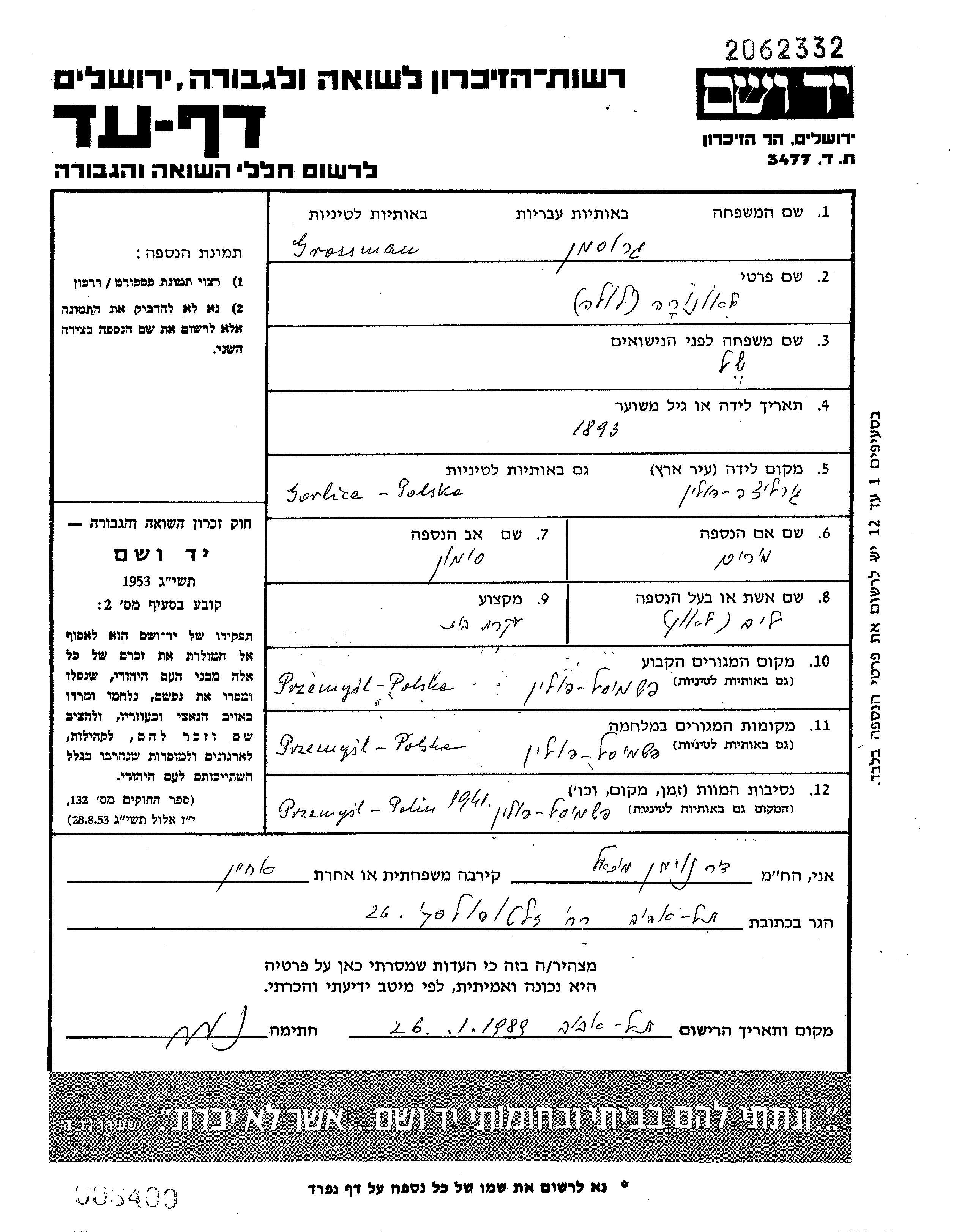 Leonora Lola Grossman, geb. Shel wurde im Jahr 1893 in Gorlice, Polen geboren. Sie war die Tochter von Simon und Miriam. Sie war Hausfrau und mit Leib Leon Verheiratet. Vor dem Zweiten Weltkrieg lebte sie in Przemysl, Polen. Während des Krieges war sie in Przemysl, Polen.
