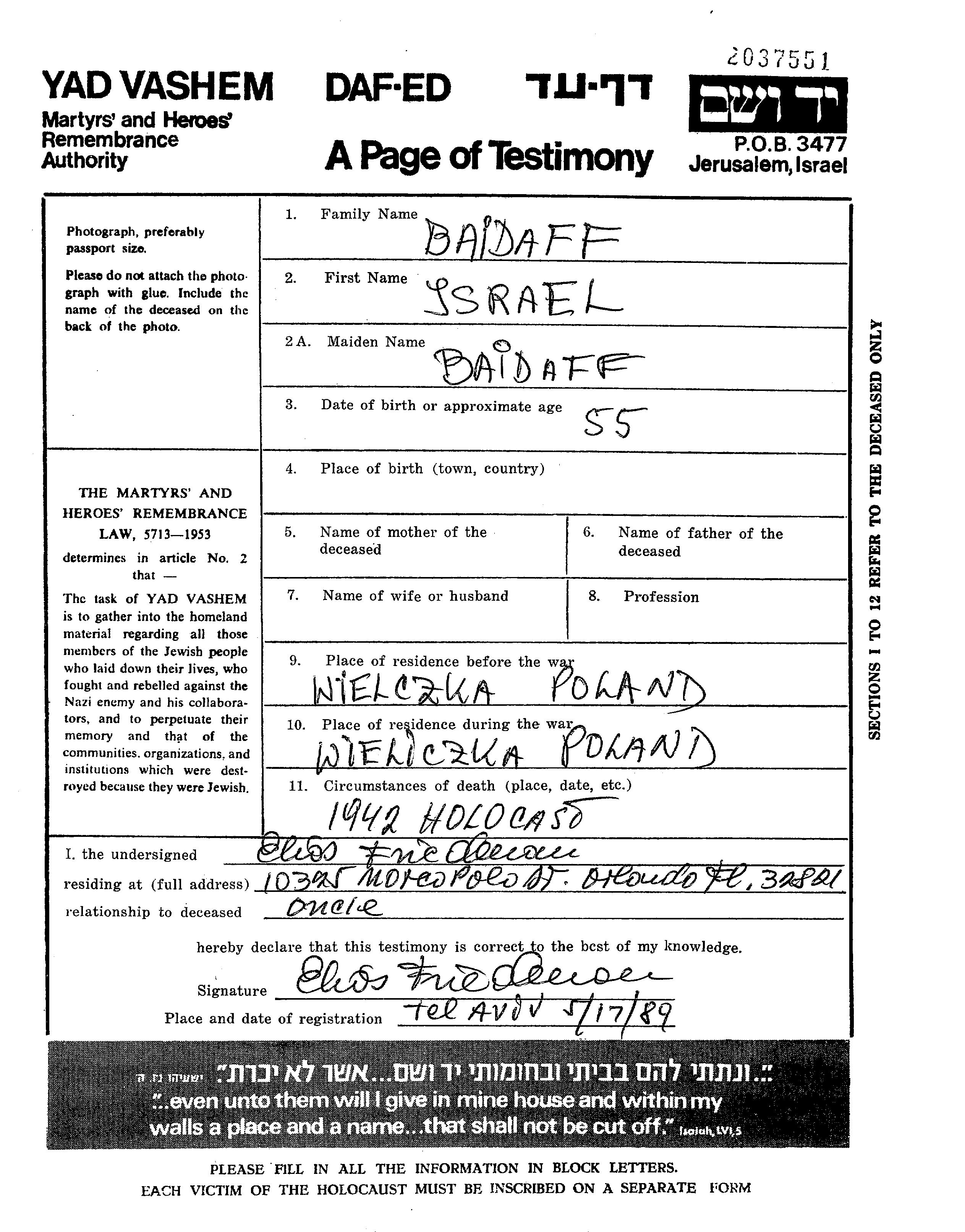 Israel Baidaff. Er war mit Polda Verheiratet. Vor dem Zweiten Weltkrieg lebte er in Wieliczka, Polen. Während des Krieges war er in Wieliczka, Polen.