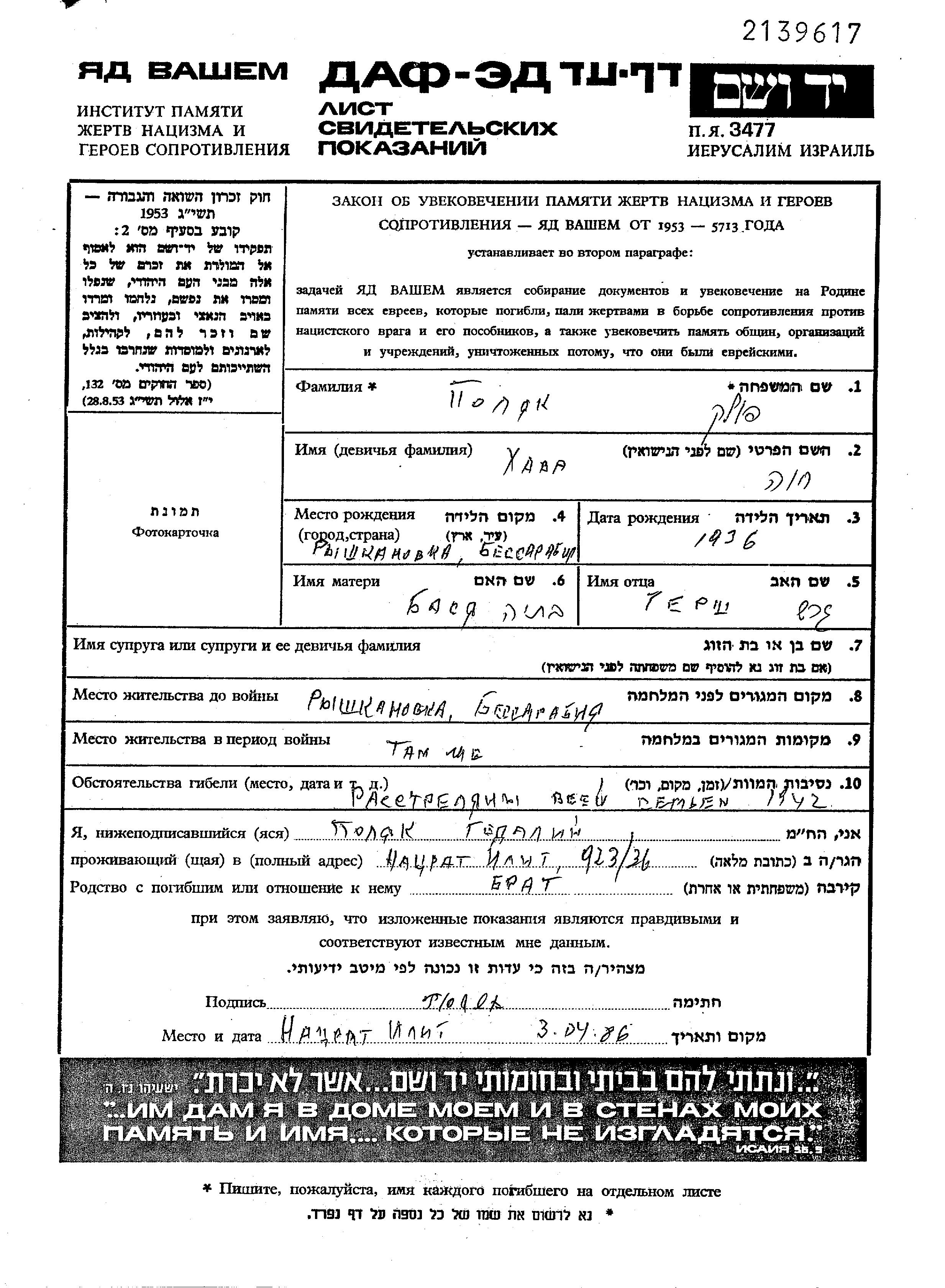 Polyak Khava Ryshkany, Rumänien Gedenkblatt