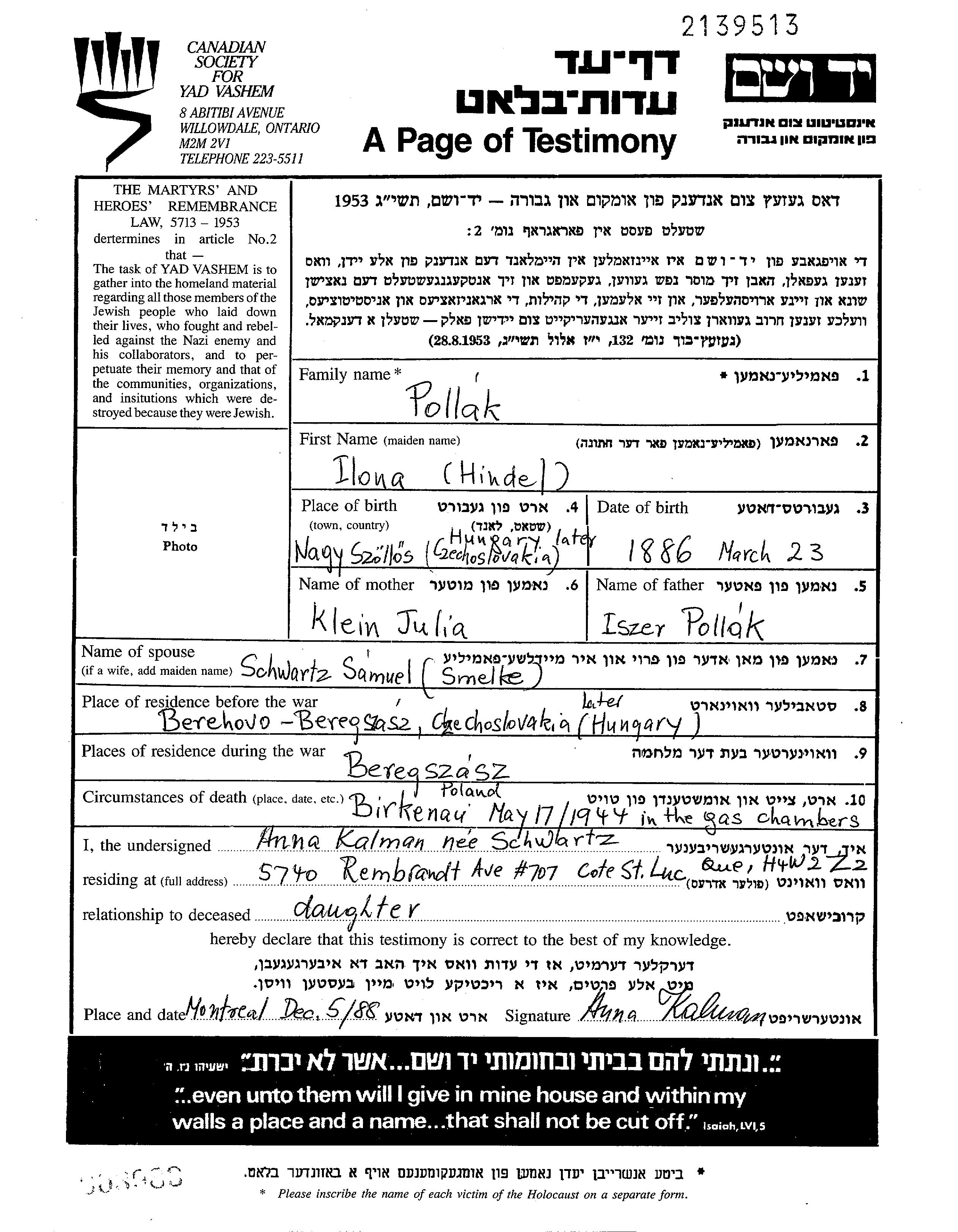 Hindel Ilona Pollak Schwartz, geb. Pollak wurde im Jahr 1886 in Nagyszollos, Tschechoslowakei geboren. Sie war die Tochter von Iszer und Julia, geb. Klein. Sie war mit Smelke Verheiratet. Vor dem Zweiten Weltkrieg lebte sie in Berehovo, Tschechoslowakei. Während des Krieges war sie in Beregszasz, Tschechoslowakei.
