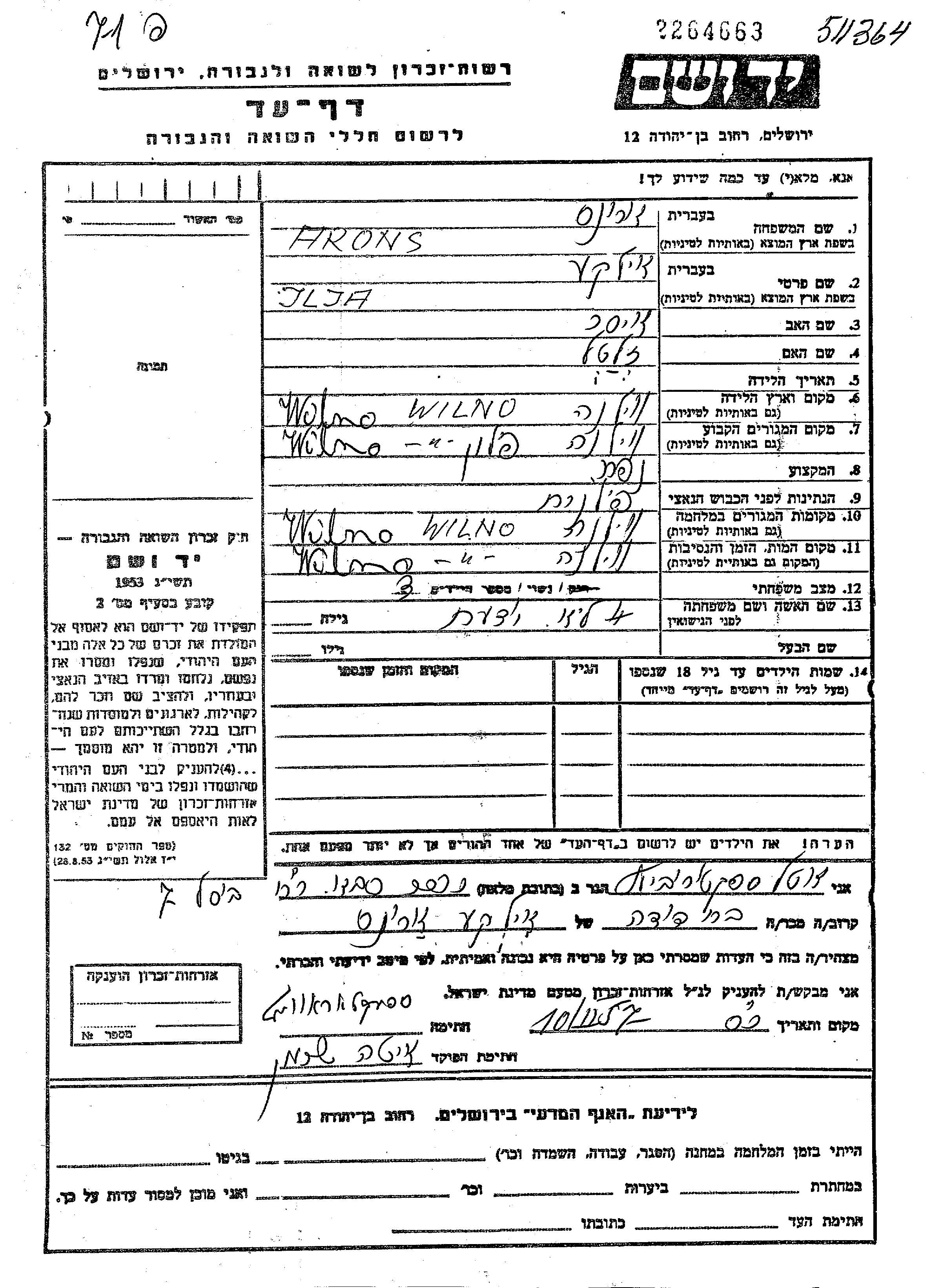 Ilka Arons wurde in Wilno, Polen geboren. Sie war die Tochter von Isser und Zlatl. Sie war Schmied und Verheiratet. Vor dem Zweiten Weltkrieg lebte sie in Wilno, Polen. Während des Krieges war sie in Wilno, Polen.