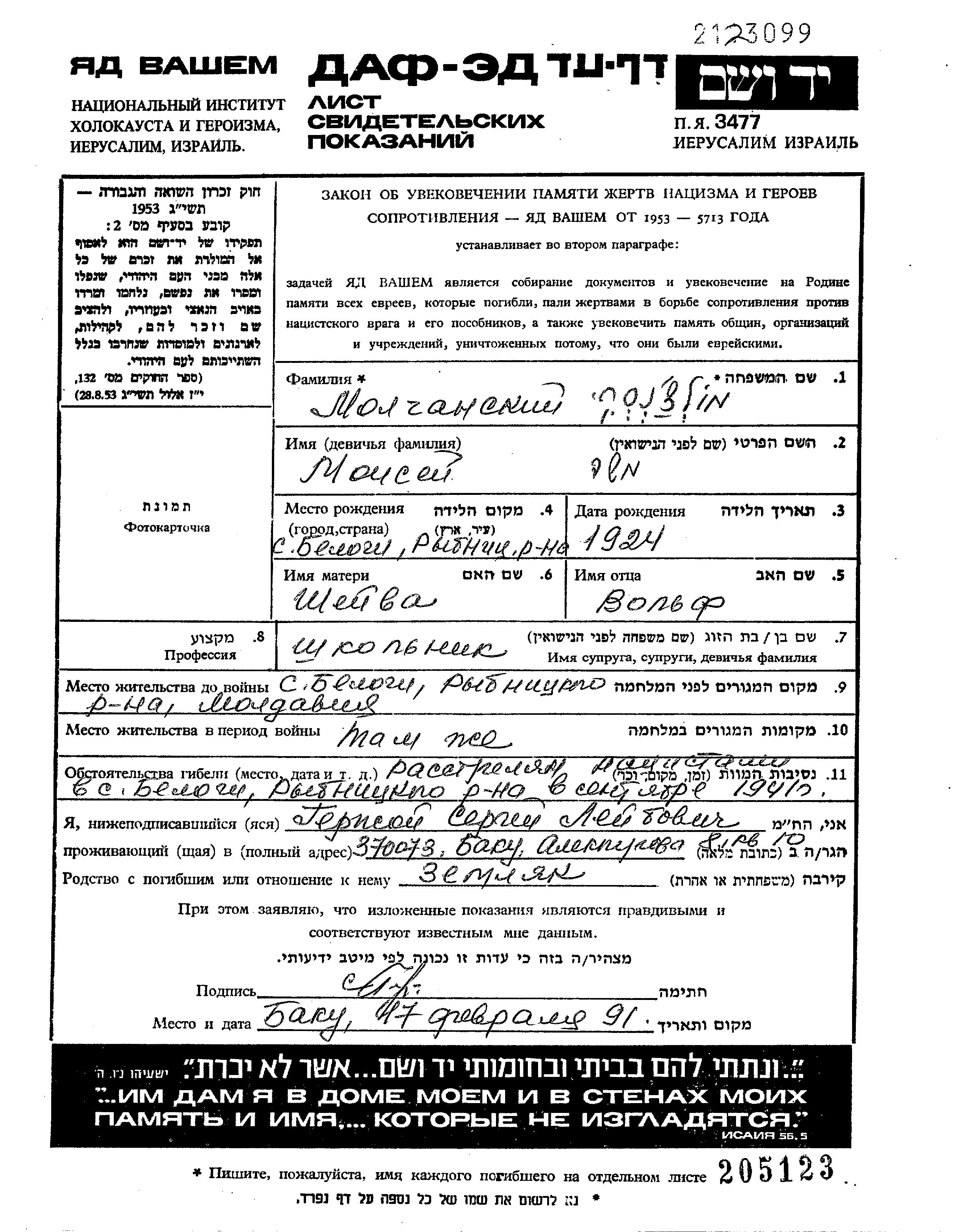 Moisei Molchanski wurde im Jahr 1924 in Belochi, Ukraine (UdSSR) geboren. Er war der Sohn von Volf und Sheiva. Er war Schüler/-in und Kind. Vor dem Zweiten Weltkrieg lebte er in Belochi, Ukraine (UdSSR). Während des Krieges war er in Belochi, Ukraine (UdSSR).