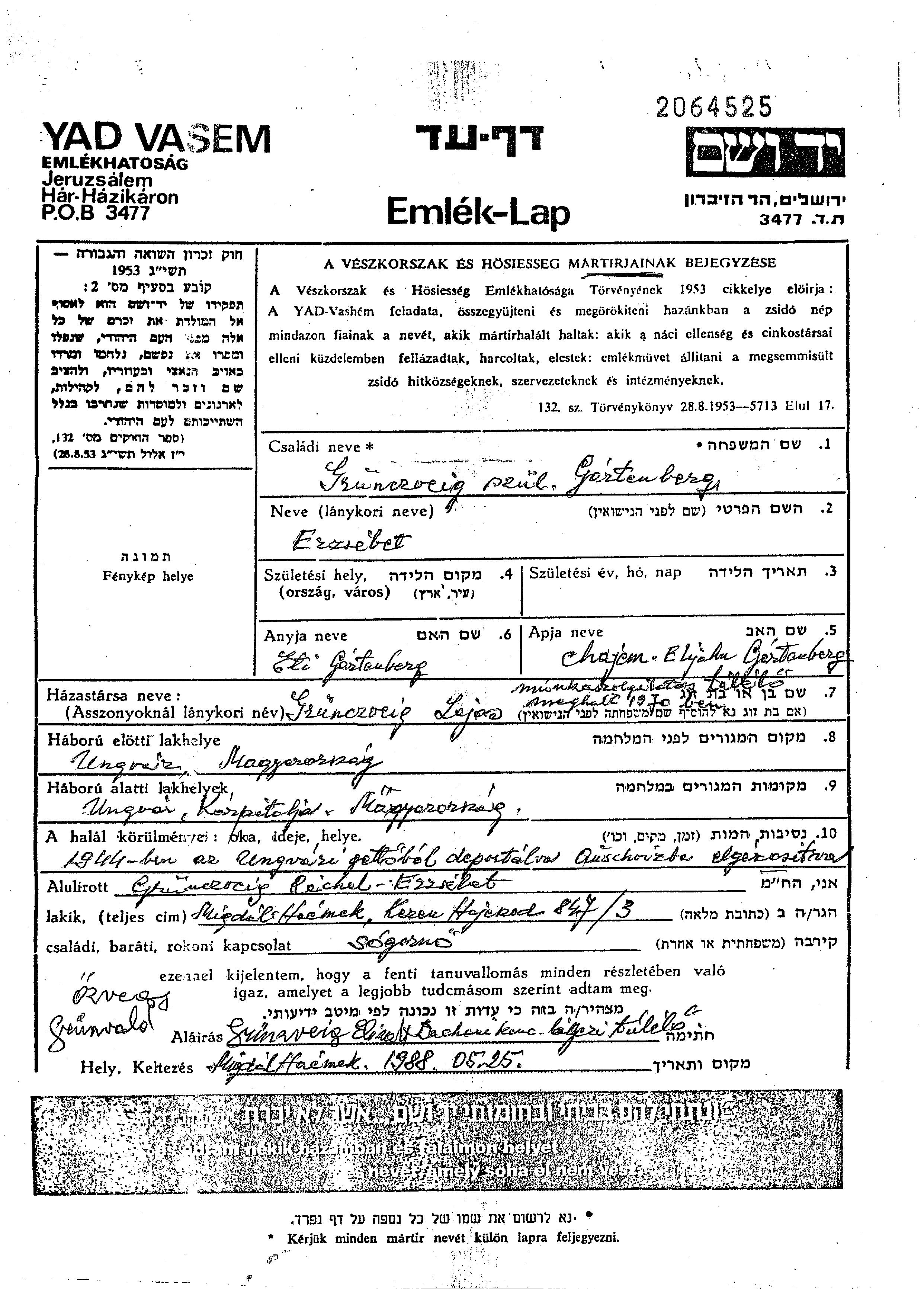 Erzsebet Gruenczveig, geb. Gartenberg wurde Sie war die Tochter von Chajem Elijahu und Eti. Sie war mit Lajos Verheiratet. Vor dem Zweiten Weltkrieg lebte sie in Ungvar, Tschechoslowakei. Während des Krieges war sie in Ungvar, Tschechoslowakei.
