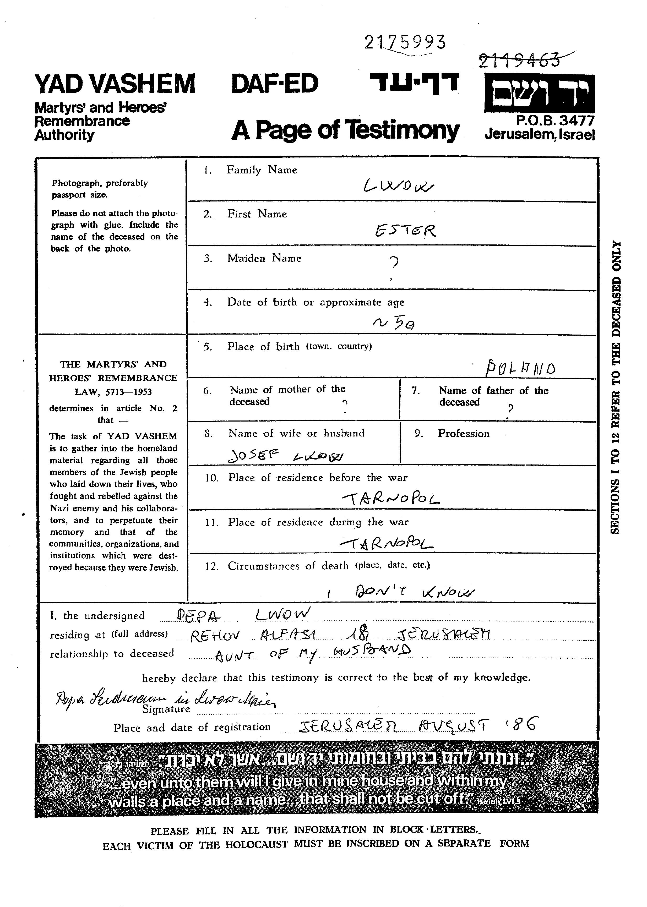 Ester Lwow wurde in Polen geboren. Sie war mit Josef Verheiratet. Vor dem Zweiten Weltkrieg lebte sie in Tarnopol, Polen. Während des Krieges war sie in Tarnopol, Polen.