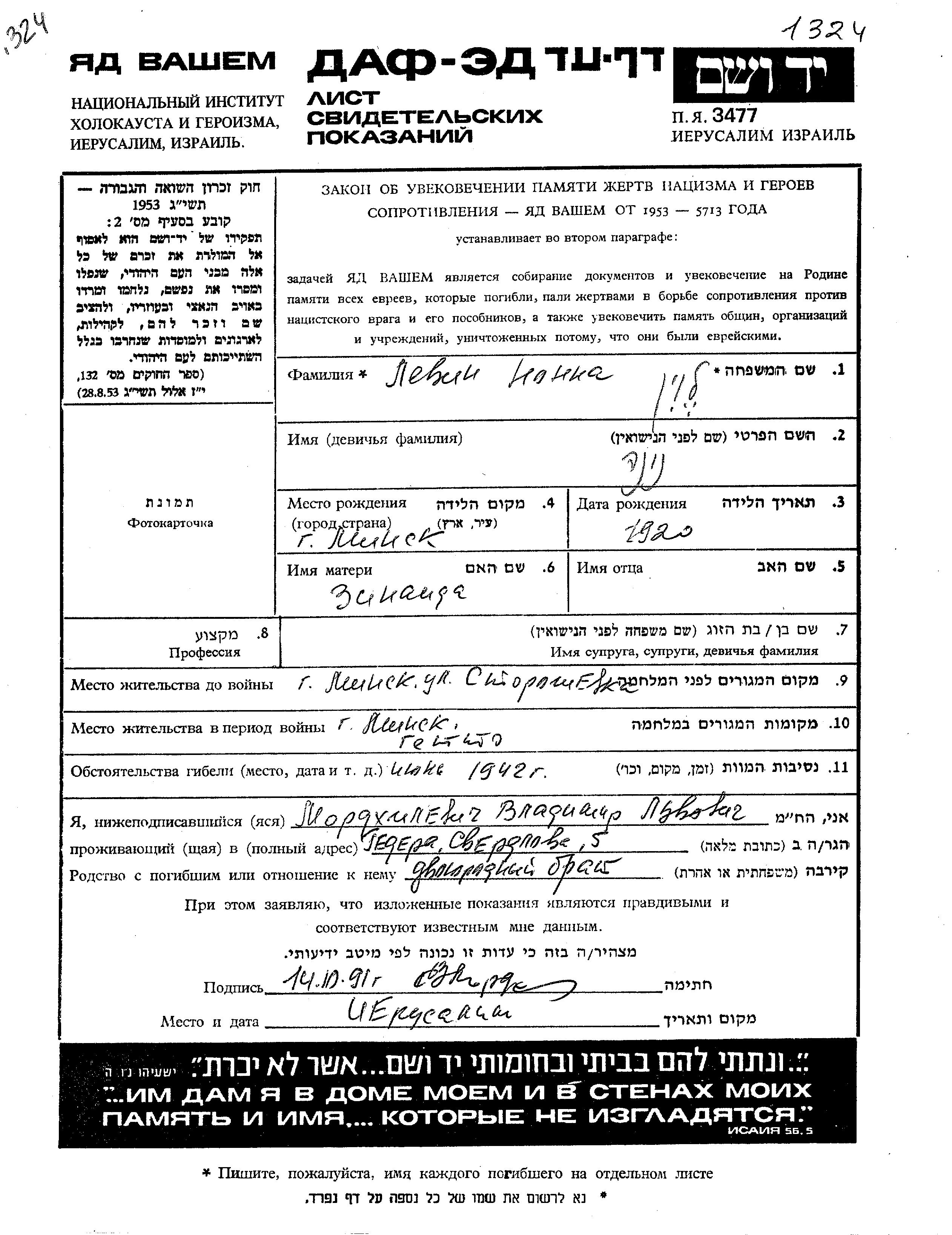 Nona Nuna Levin wurde im Jahr 1920 in Minsk, Weißrussland (UdSSR) geboren. Sie war die Tochter von Zinaida. Vor dem Zweiten Weltkrieg lebte sie in Minsk, Weißrussland (UdSSR). Während des Krieges war sie in Minsk, Weißrussland (UdSSR).