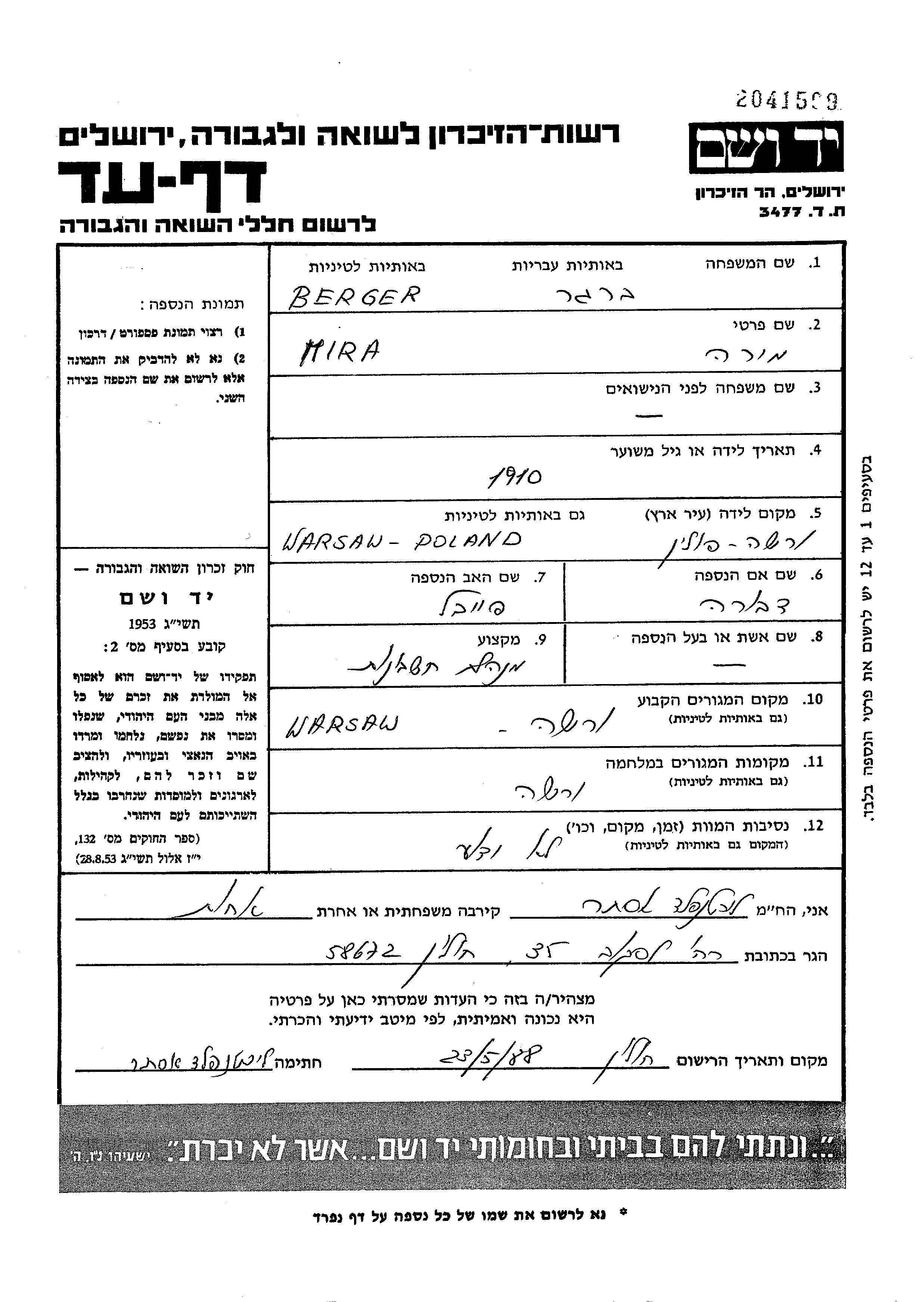 Mira Berger wurde im Jahr 1910 in Warszawa, Polen geboren. Sie war die Tochter von Faivel und Dvora. Sie war Buchhalter/-in. Vor dem Zweiten Weltkrieg lebte sie in Warszawa, Polen. Während des Krieges war sie in Warszawa, Polen.