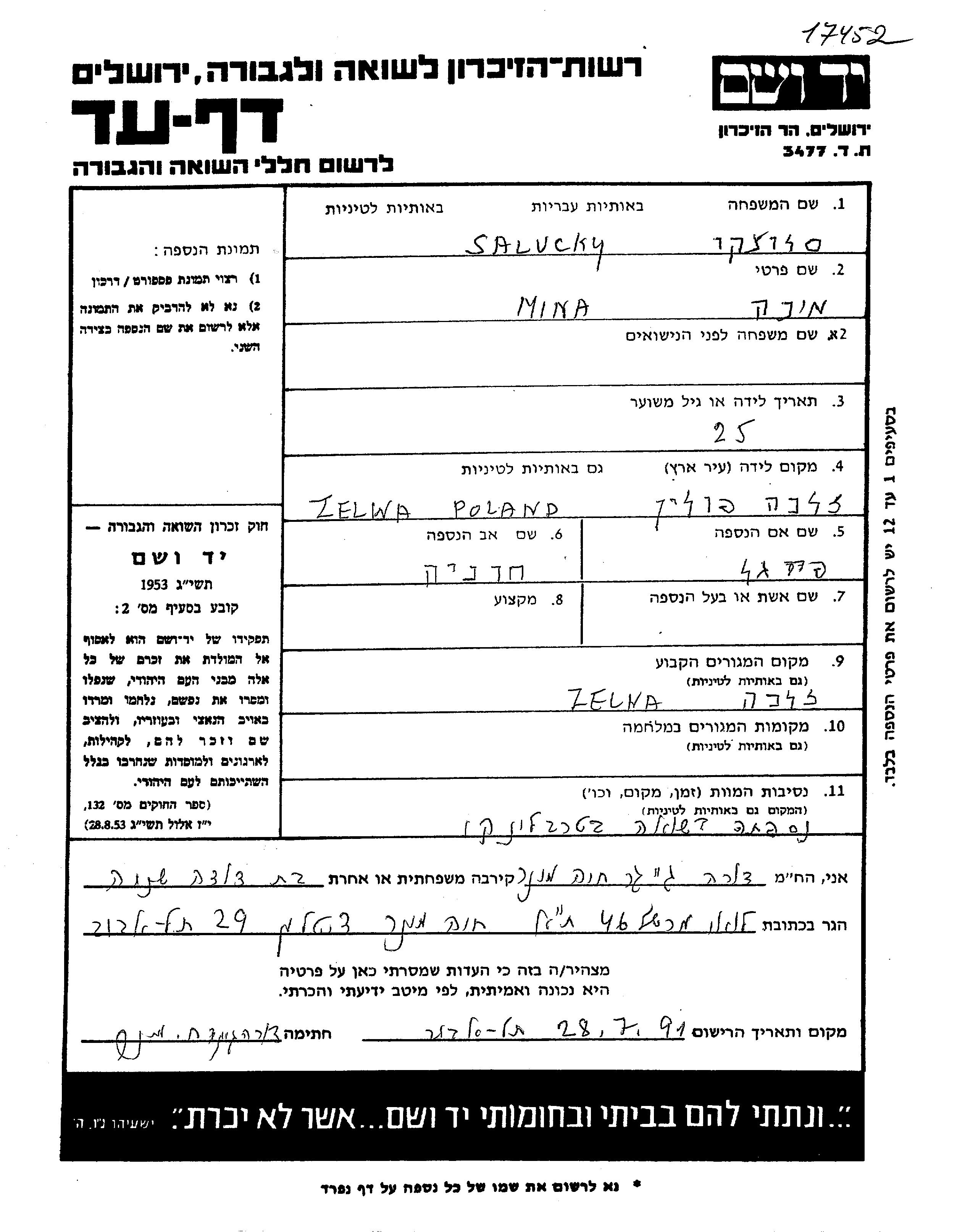 Mina Salucky wurde in Zelwa, Polen geboren. Sie war die Tochter von Honie und Feigel. Vor dem Zweiten Weltkrieg lebte sie in Zelwa, Polen. Während des Krieges war sie in Zelwa, Polen.