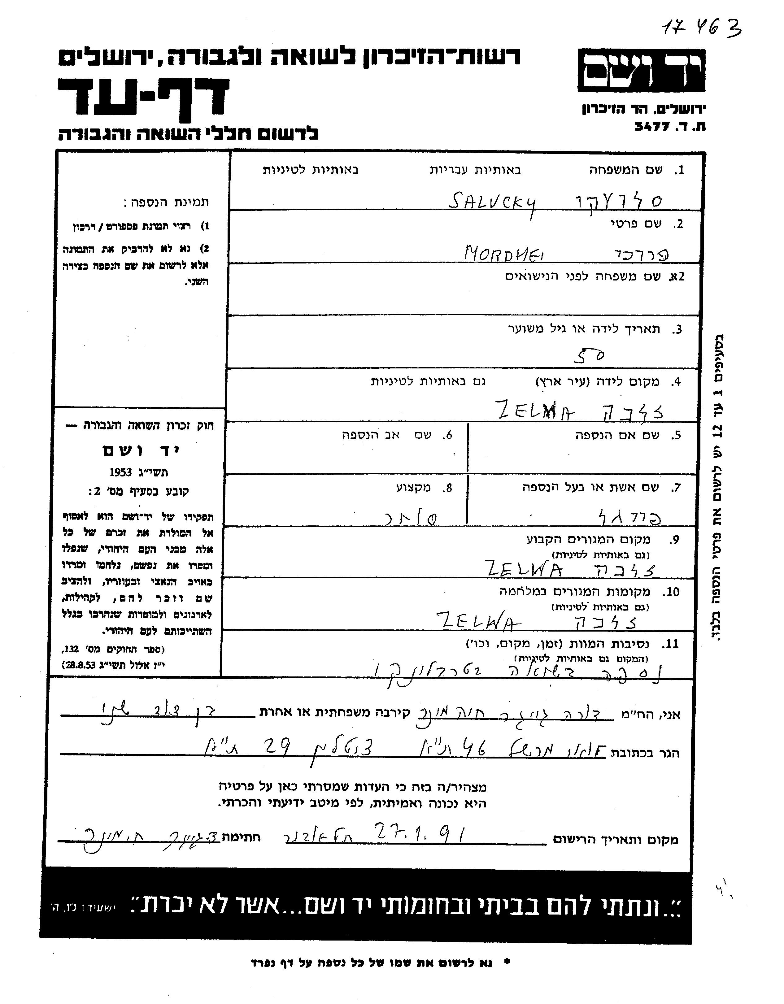 Mordhei Salucky wurde in Zelwa, Polen geboren. Er war Kaufmann/-frau und mit Feigel Verheiratet. Vor dem Zweiten Weltkrieg lebte er in Zelwa, Polen. Während des Krieges war er in Zelwa, Polen.
