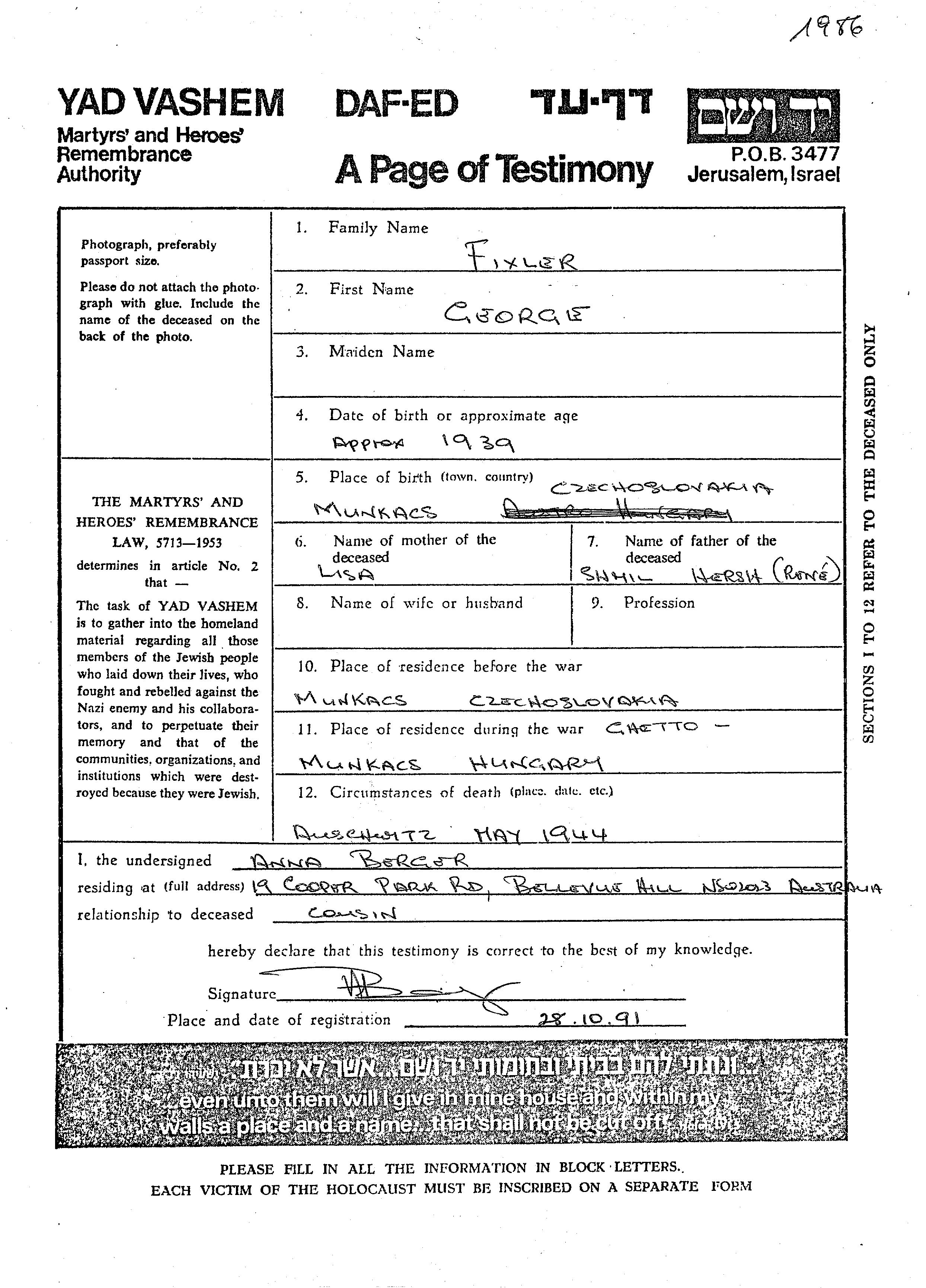 George Fixler wurde im Jahr 1939 in Munkacs, Tschechoslowakei geboren. Er war der Sohn von Shmil Hersh Rene und Lisa, geb. Leichter. Er war Kind. Vor dem Zweiten Weltkrieg lebte er in Munkacs, Tschechoslowakei. Während des Krieges war er in Munkacs, Tschechoslowakei.