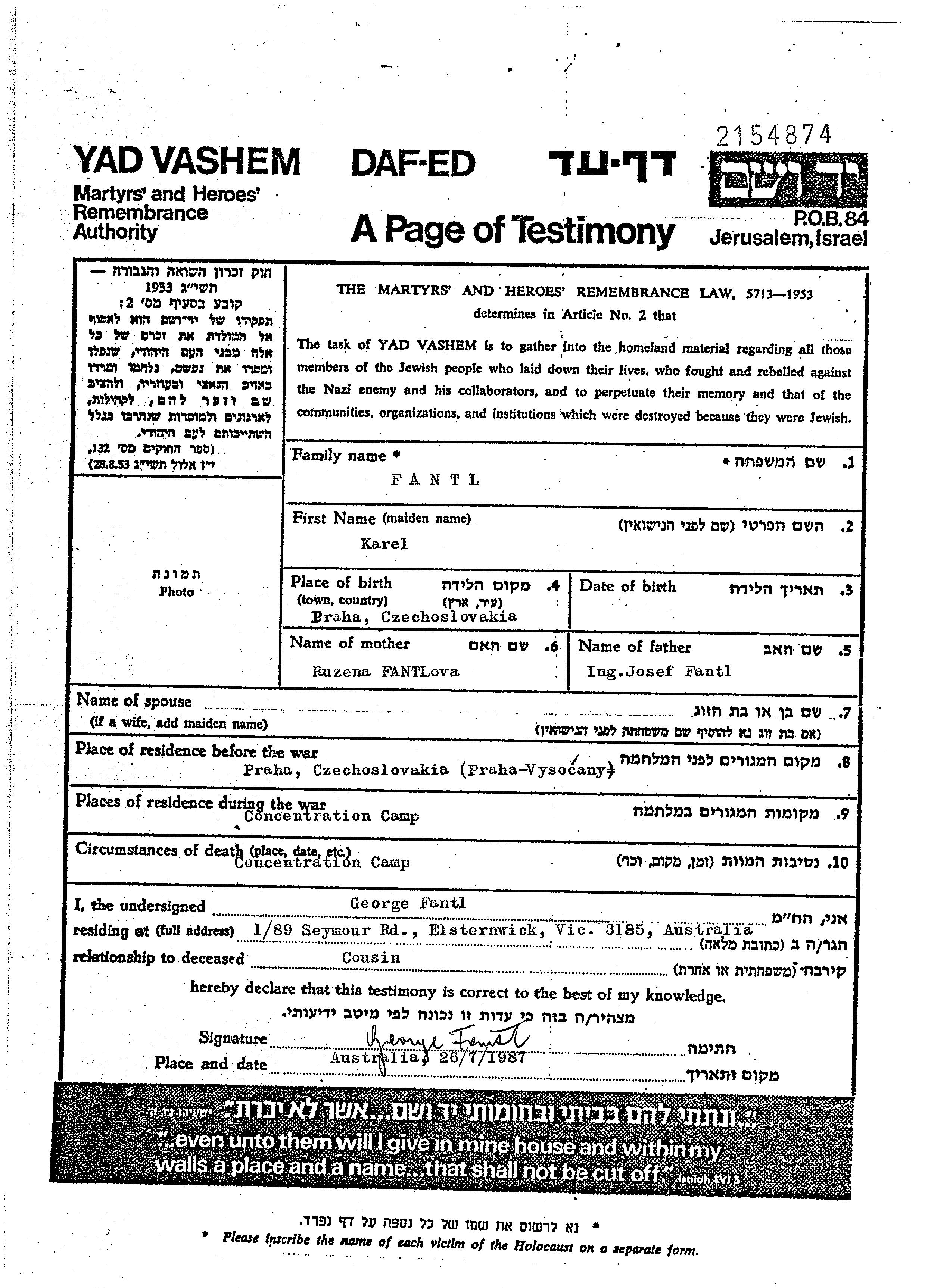 Karel Fantl wurde in Praha, Tschechoslowakei geboren. Er war der Sohn von Josef und Ruzena Rosanna, geb. Bloch. Vor dem Zweiten Weltkrieg lebte er in Vysocany, Tschechoslowakei.