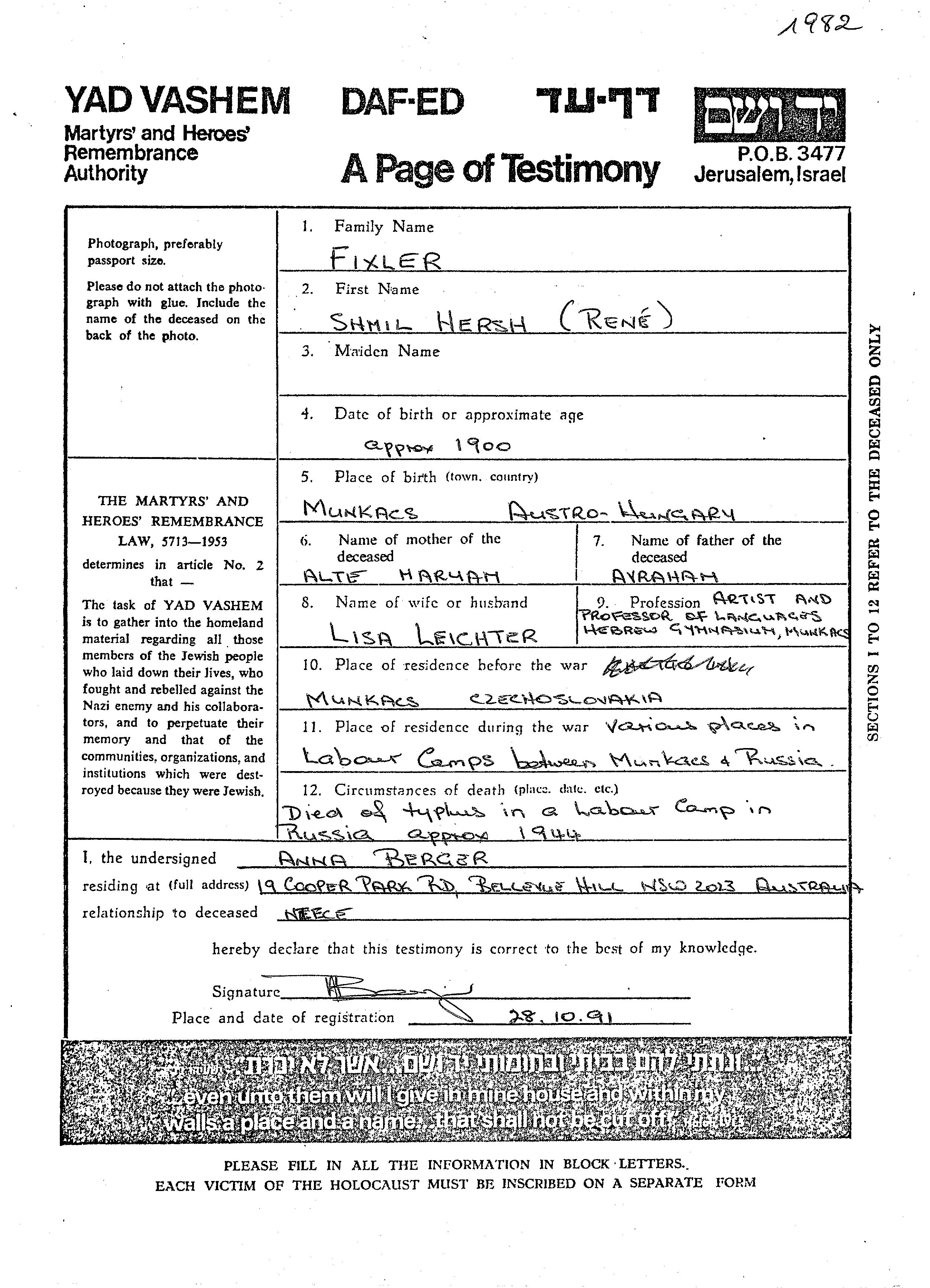 Shmil Hersh Rene Fixler wurde im Jahr 1900 in Munkacs, Tschechoslowakei geboren. Er war der Sohn von Avraham und Maryam Alte, geb. Reich. Er war Sprachlehrer und mit Lisa Verheiratet. Vor dem Zweiten Weltkrieg lebte er in Munkacs, Tschechoslowakei. Während des Krieges war er in Munkacs, Tschechoslowakei.