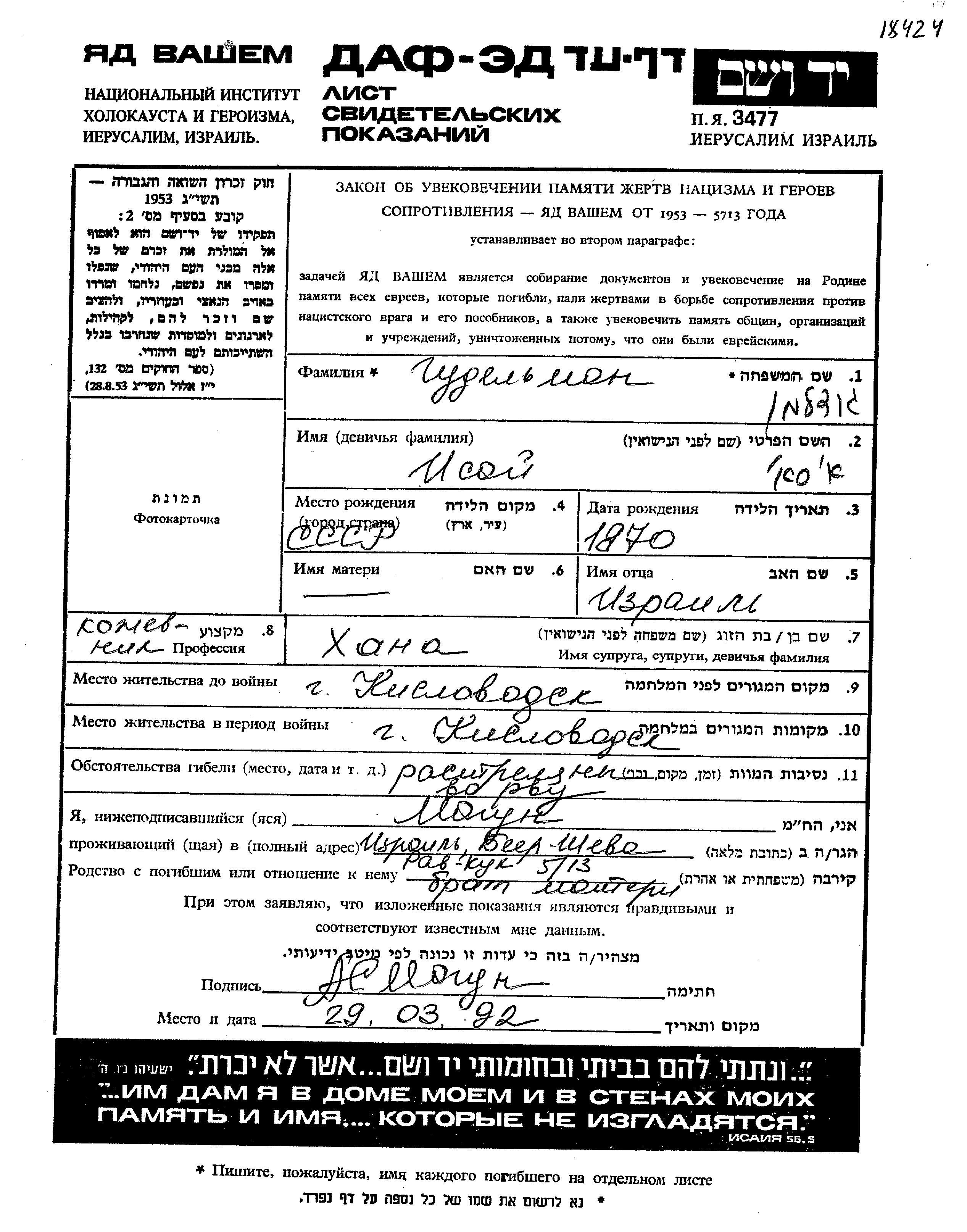 Isai wurde in der Schoah ermordet. Todesort: Kislovodsk, Russland (UdSSR).