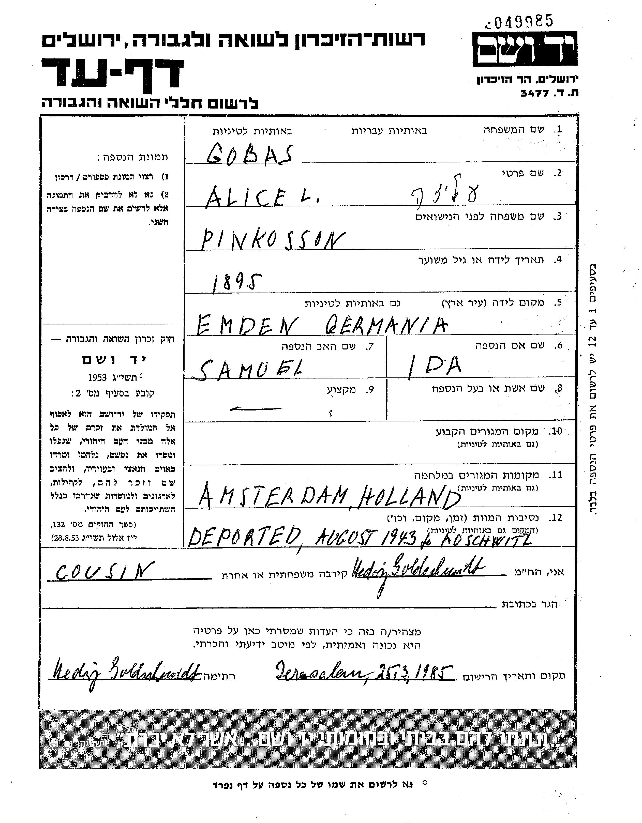 Alice Aliza Gobas, geb. Pinkusson wurde im Jahr 1895 in Emden, Deutsches Reich geboren. Sie war die Tochter von Samuel und Ida. Während des Krieges war sie in Amsterdam, Niederlande.
