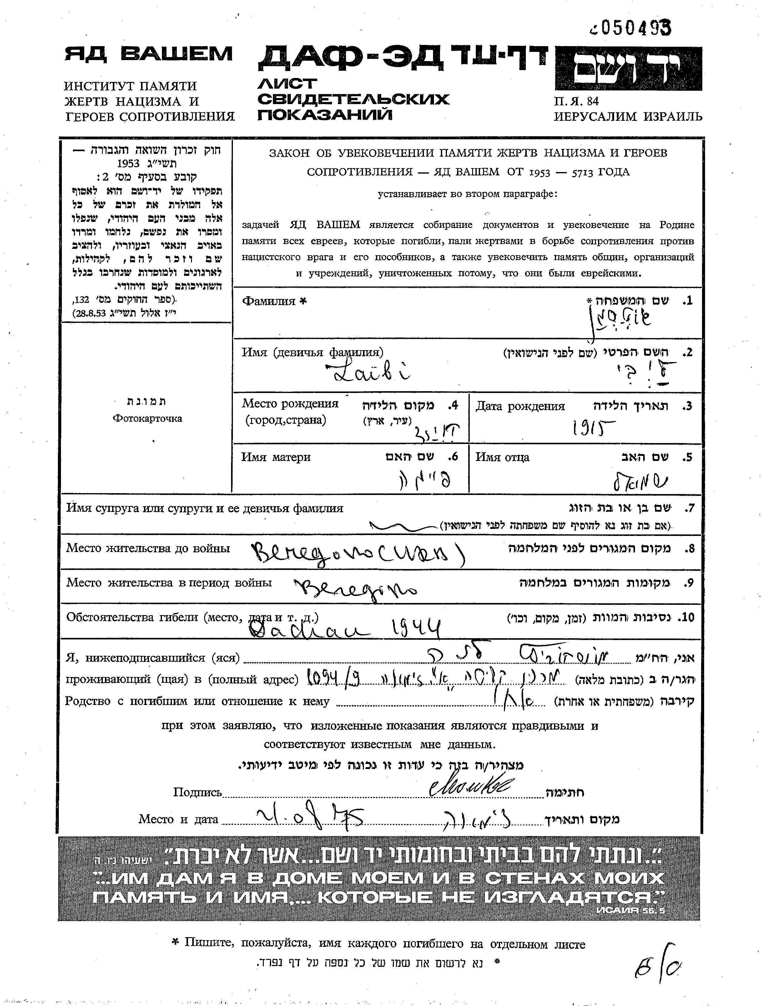 Laibi wurde in der Schoah ermordet. Todesort: Dachau, Deutsches Reich im Jahr 1944.