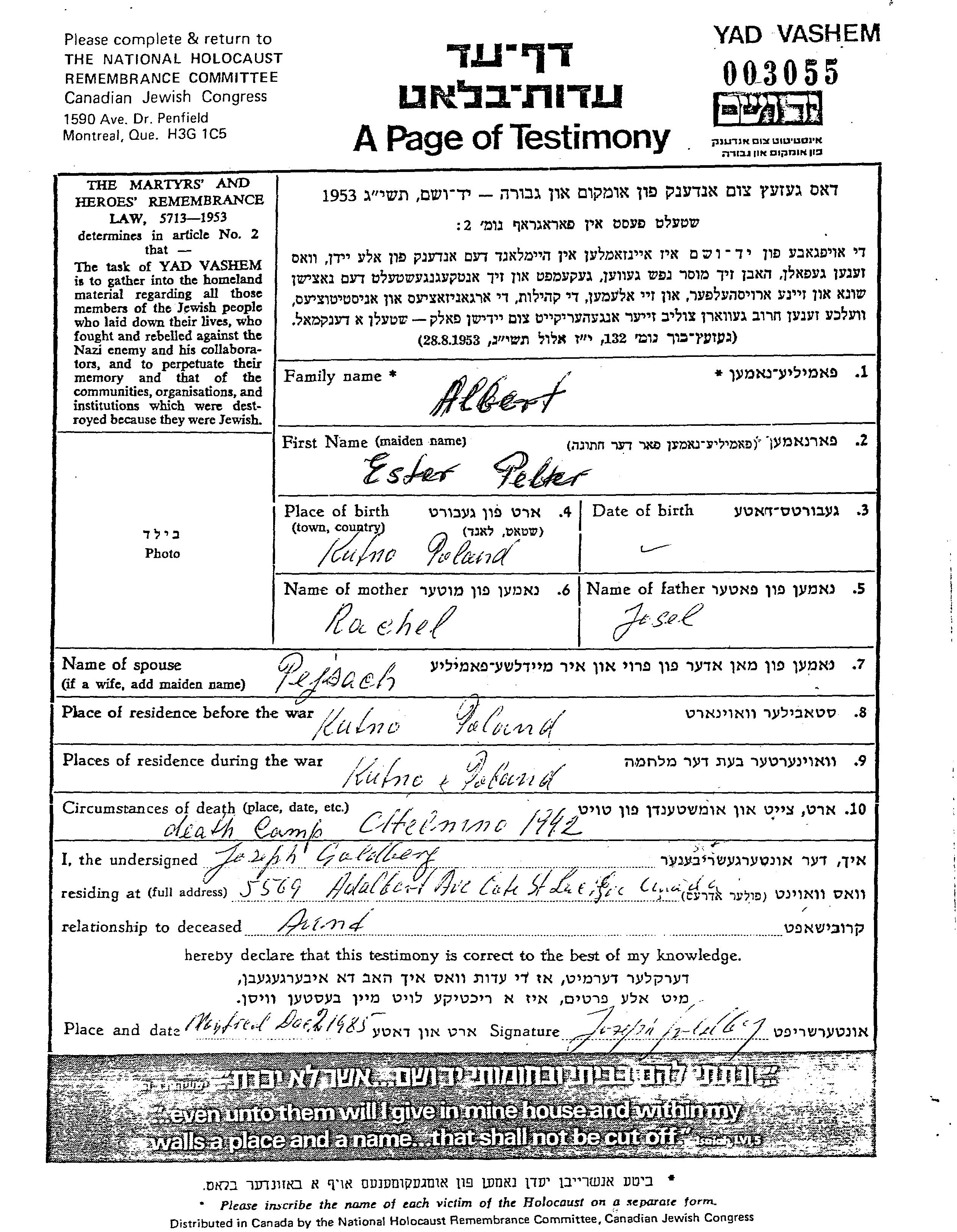 Ester wurde in der Schoah ermordet. Todesort: Chelmno, Polen im Jahr 1942.
