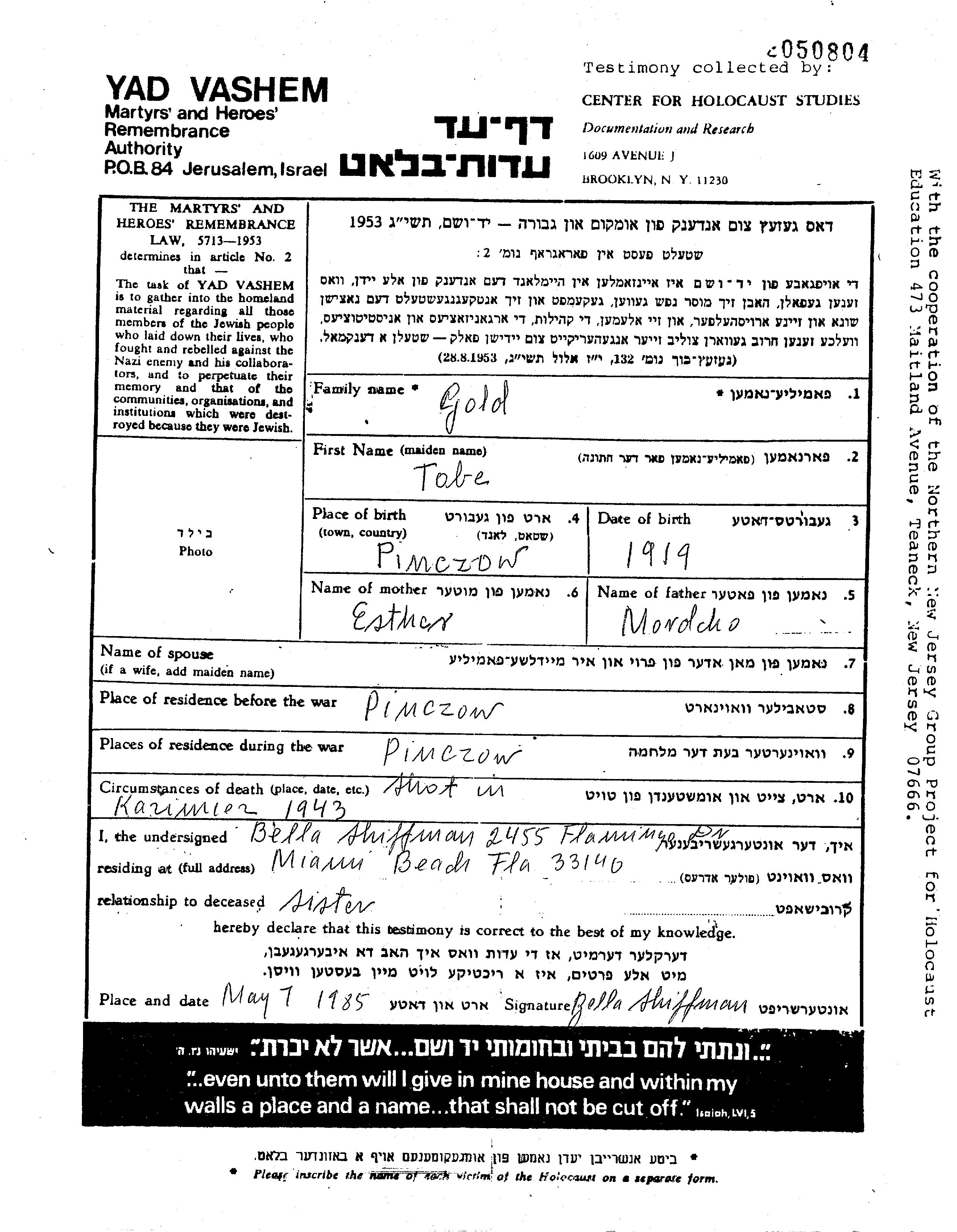 Tobe Tova Gold wurde im Jahr 1919 in Pinczow, Polen geboren. Sie war die Tochter von Mordcho und Esther. Vor dem Zweiten Weltkrieg lebte sie in Pivona, Litauen. Während des Krieges war sie in Pinczow, Polen.
