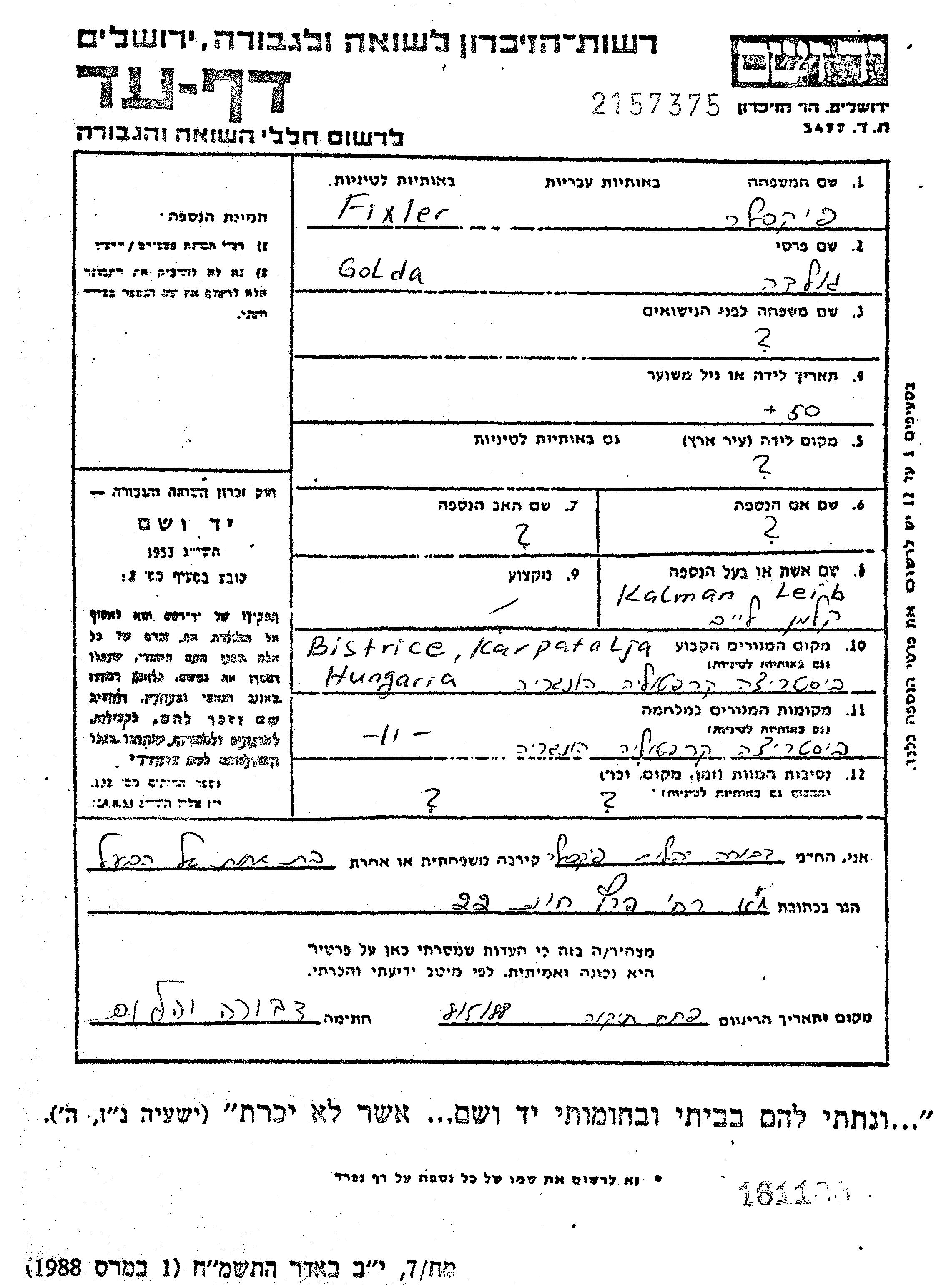 Golda Fixler. Sie war mit Leib Kalman Verheiratet. Vor dem Zweiten Weltkrieg lebte sie in Bistritz, Rumänien. Während des Krieges war sie in Bistritz, Rumänien.