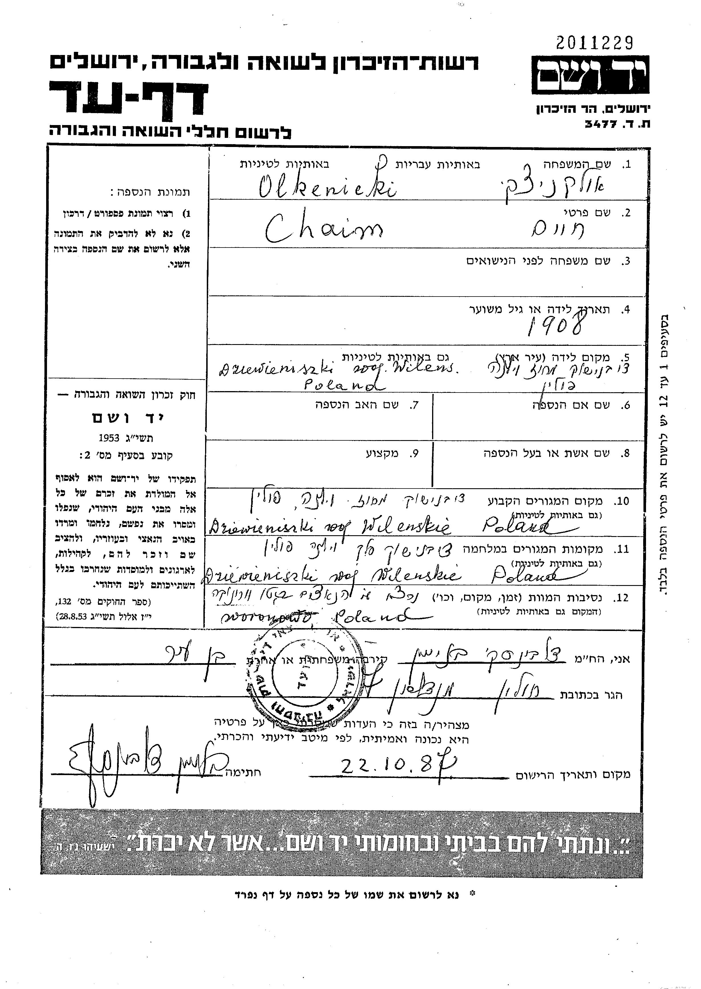 Chaim Olkenicki wurde im Jahr 1908 in Dziewieniszki, Polen geboren. Er war Verheiratet. Vor dem Zweiten Weltkrieg lebte er in Dziewieniszki, Polen. Während des Krieges war er in Dziewieniszki, Polen.