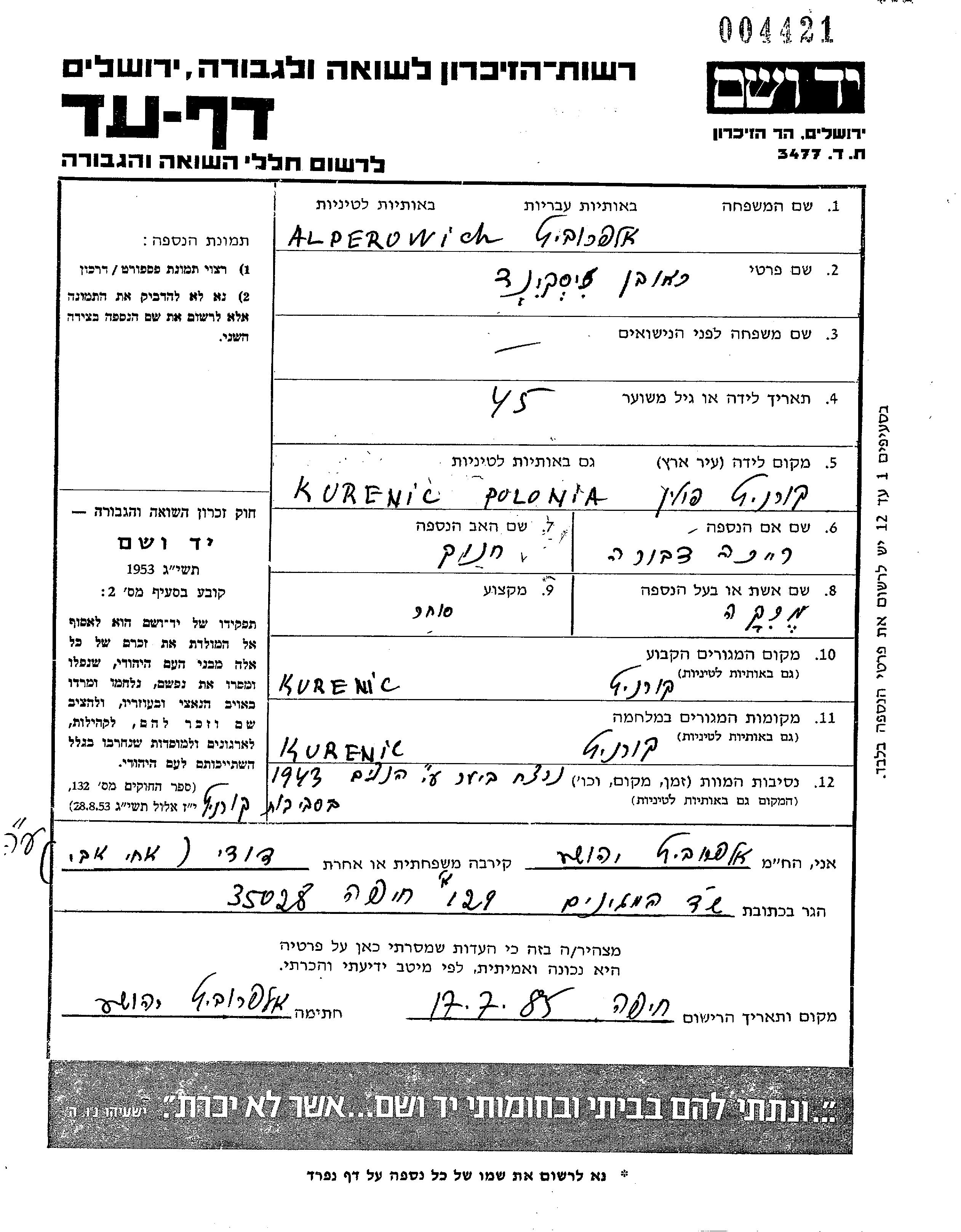 Reuven Ziskind Alperowich wurde im Jahr 1898 in Kurenets, Polen geboren. Er war der Sohn von Khanokh und Reicha Dvora. Er war Kaufmann/-frau und mit Merka Verheiratet. Vor dem Zweiten Weltkrieg lebte er in Kurenets, Polen. Während des Krieges war er in Kurenets, Polen.