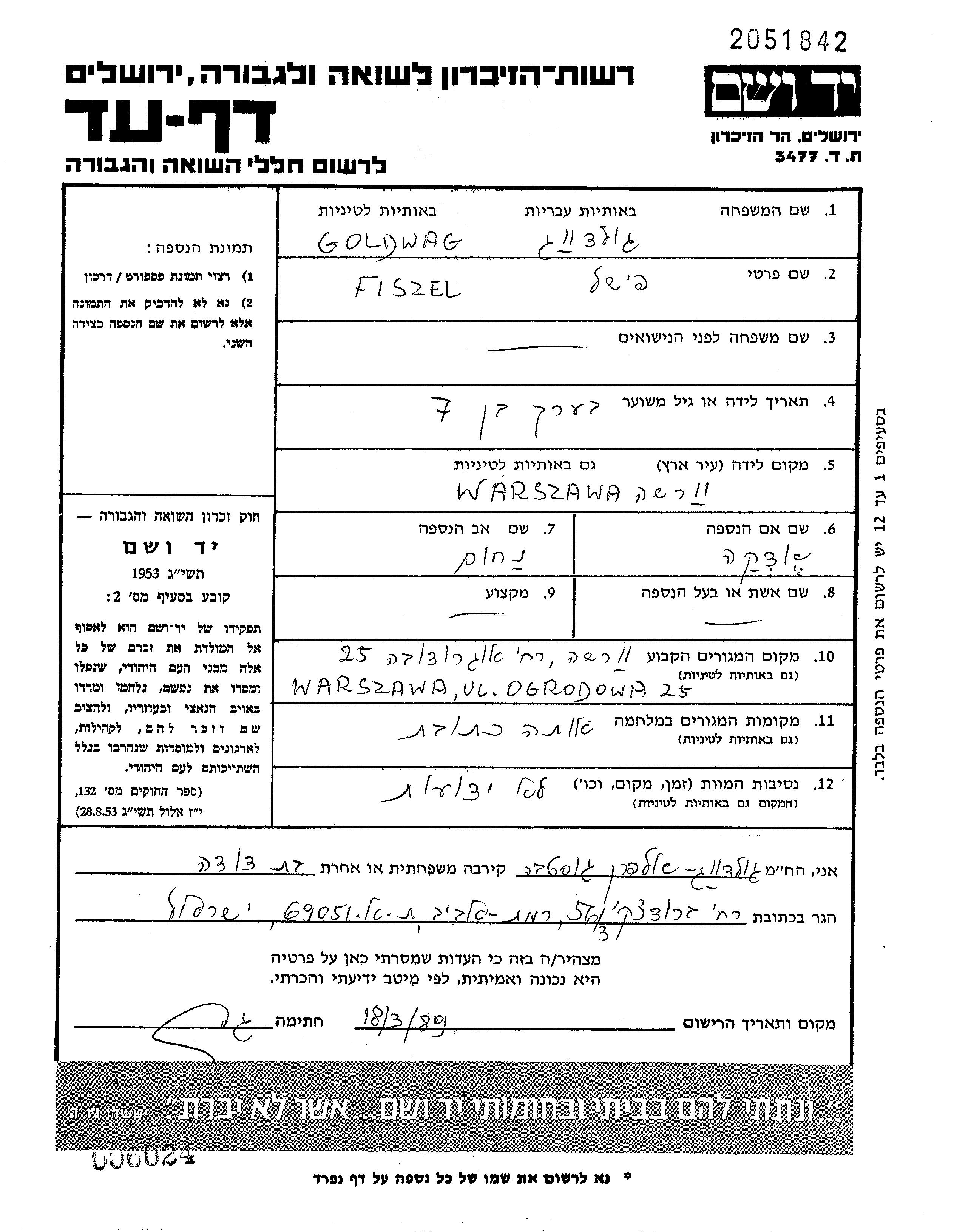 Goldwag Fiszel Warszawa, Polen Gedenkblatt