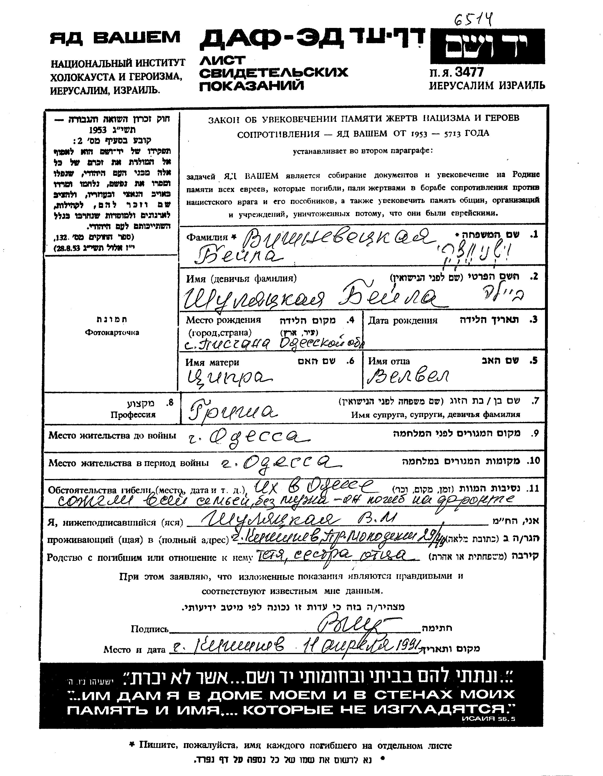 Beila wurde in der Schoah ermordet. Todesort: Odessa, Ukraine (UdSSR).