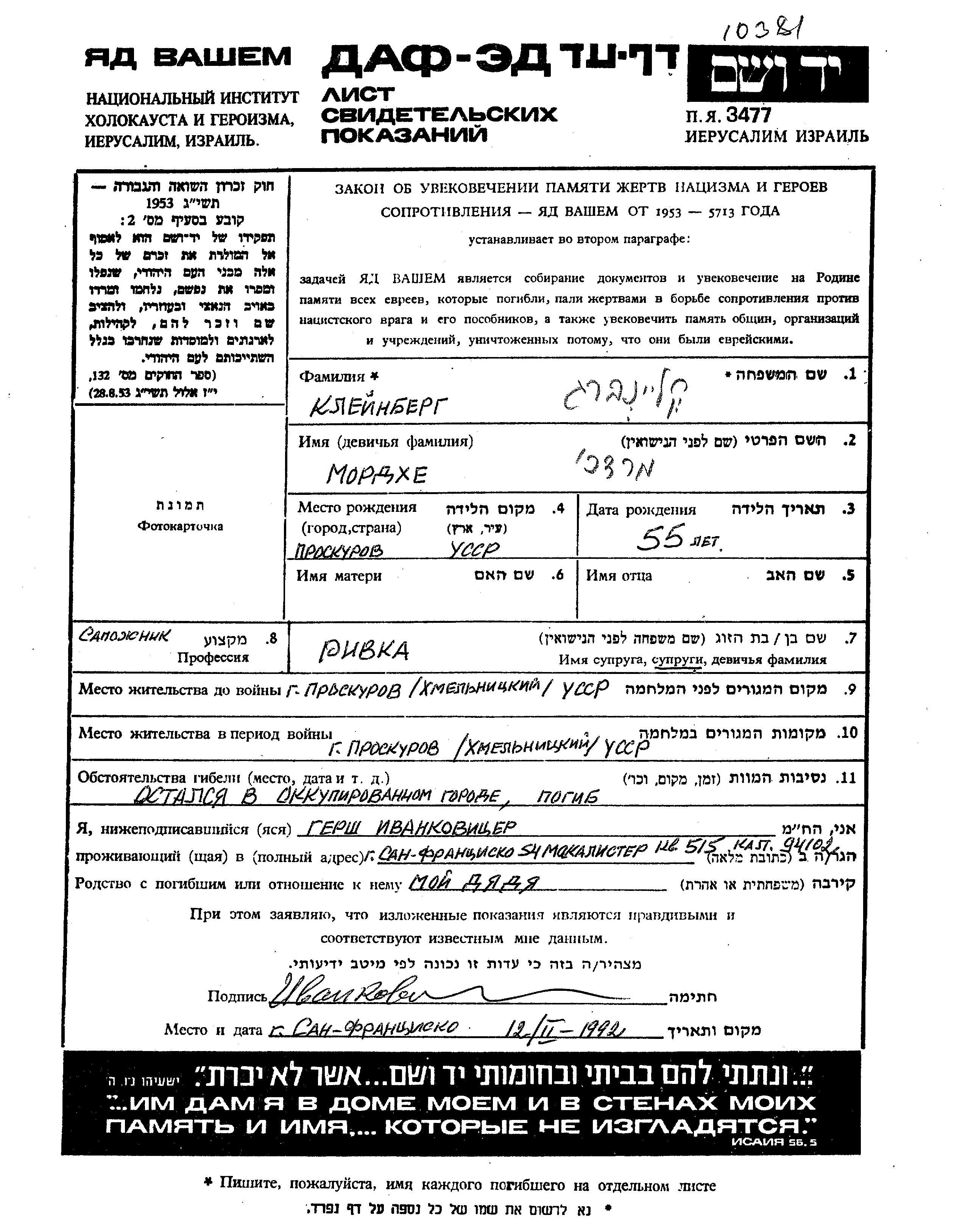 Mordkhe Kleinberg wurde in Proskurov, Ukraine (UdSSR) geboren. Er war Schuster/-in und mit Rivka Verheiratet. Vor dem Zweiten Weltkrieg lebte er in Proskurov, Ukraine (UdSSR). Während des Krieges war er in Proskurov, Ukraine (UdSSR).
