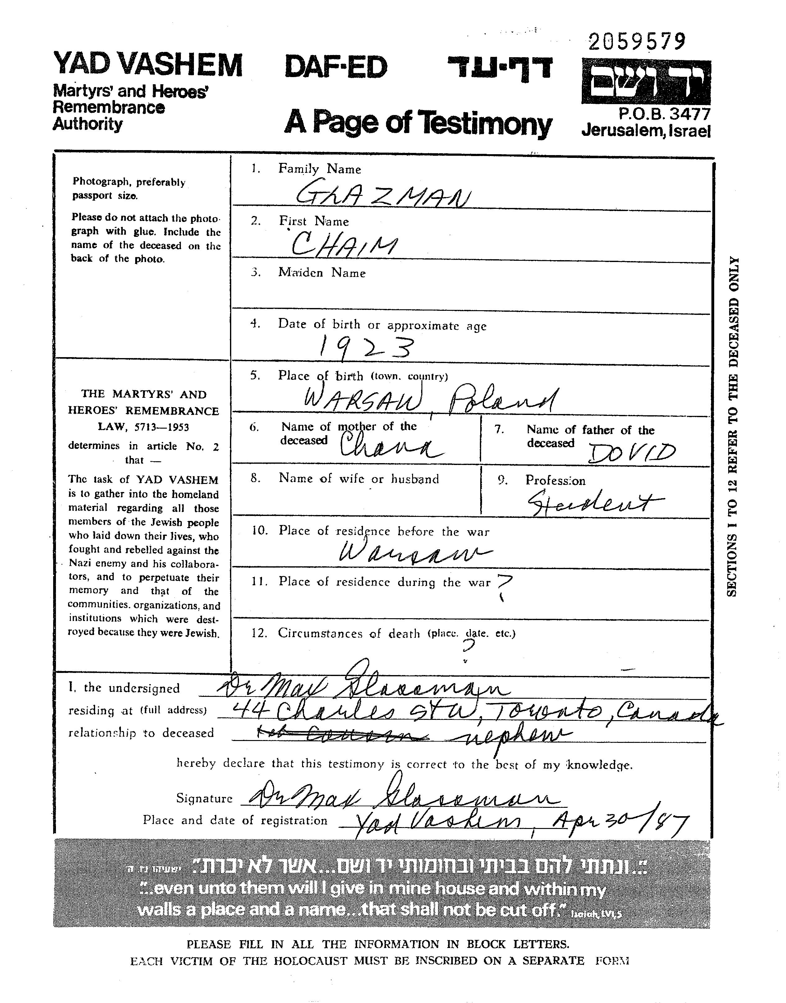 Glazman Chaim 1923 Warszawa, Polen Gedenkblatt