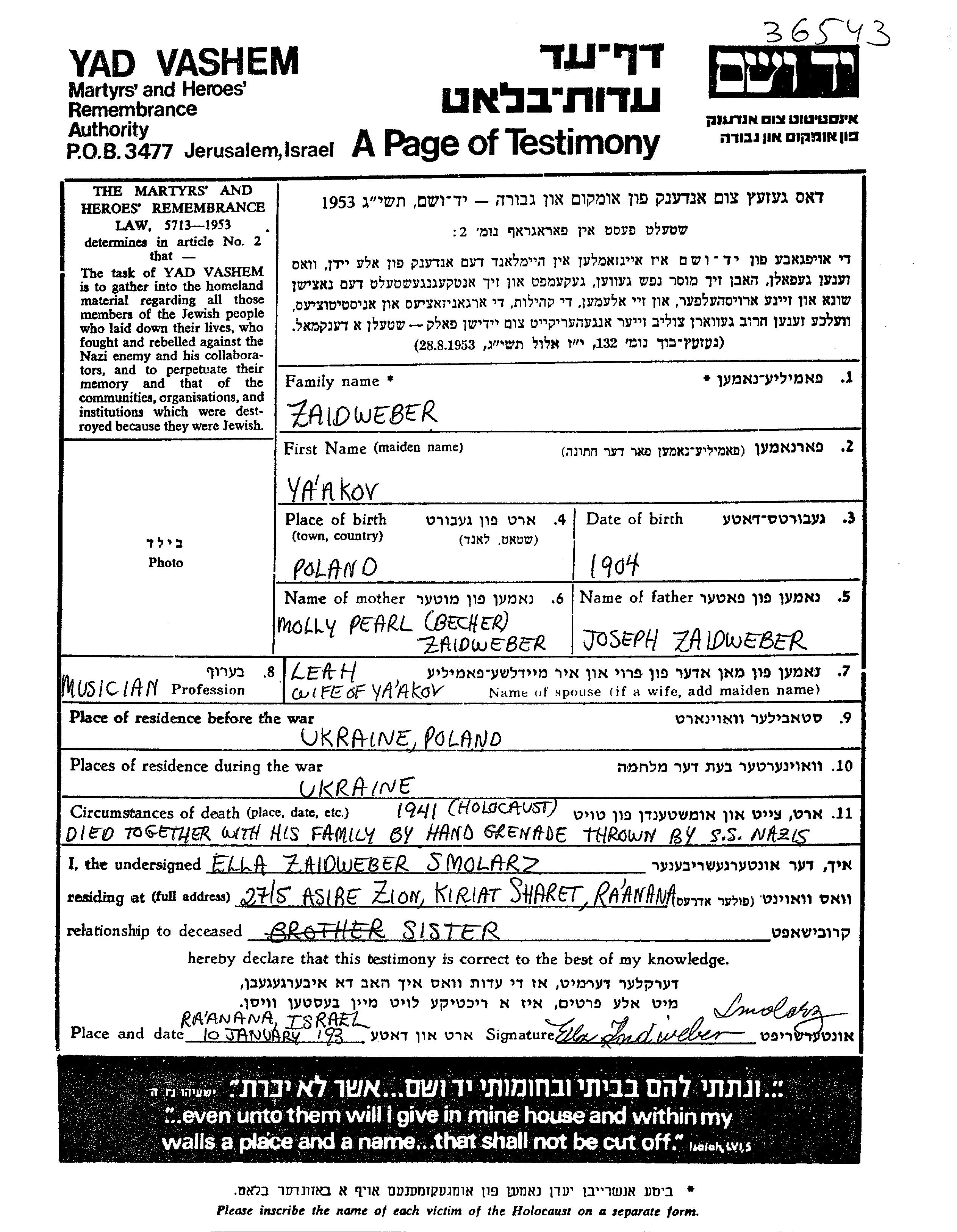 Yaakov Zaidweber wurde im Jahr 1904 in Polen geboren. Er war der Sohn von Joseph und Pearl Molly, geb. Becher. Er war Musiker/-in und mit Leah Verheiratet. Vor dem Zweiten Weltkrieg lebte er in Polen. Während des Krieges war er in Ukraine (UdSSR).