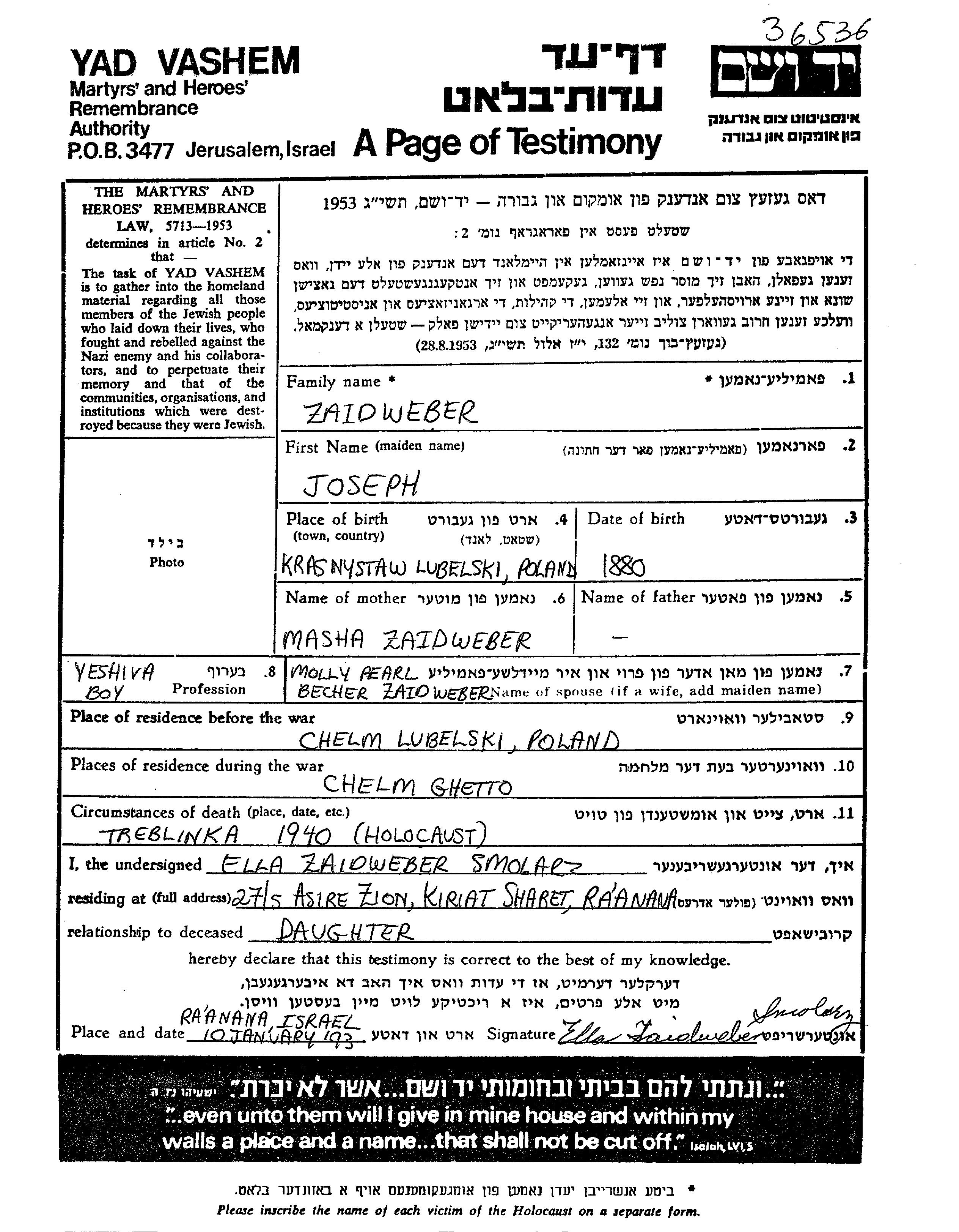 Joseph Zaidweber wurde im Jahr 1880 in Krasnystaw, Polen geboren. Er war der Sohn von Masha. Er war mit Pearl Molly Verheiratet. Vor dem Zweiten Weltkrieg lebte er in Chelm, Polen. Während des Krieges war er in Chelm, Polen.