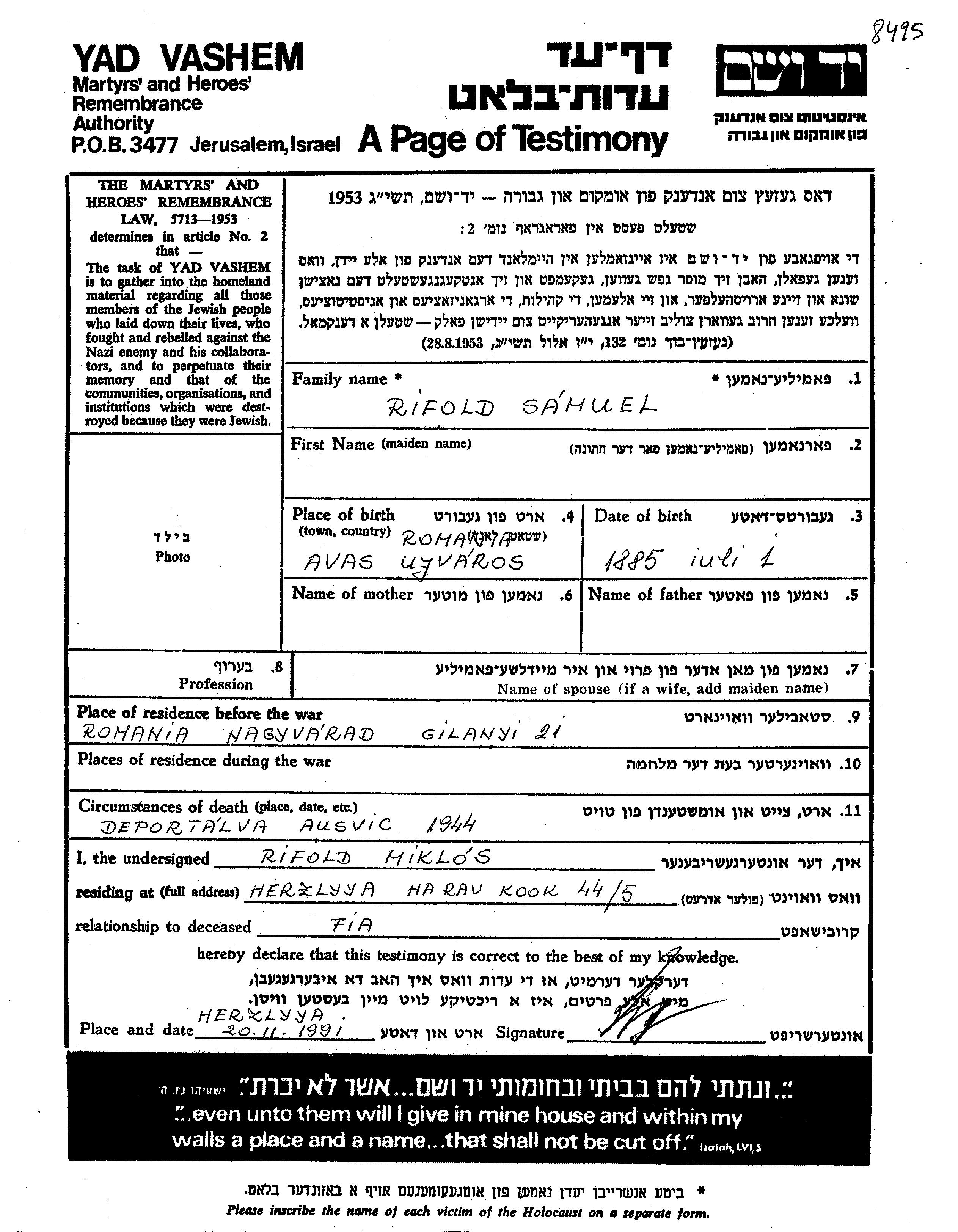 Shmuel Rifold wurde im Jahr 1885 in Avasujvaros, Rumänien geboren. Er war mit Hanni Verheiratet. Vor dem Zweiten Weltkrieg lebte er in Nagyvarad, Rumänien. Während des Krieges war er in Nagyvarad, Rumänien.