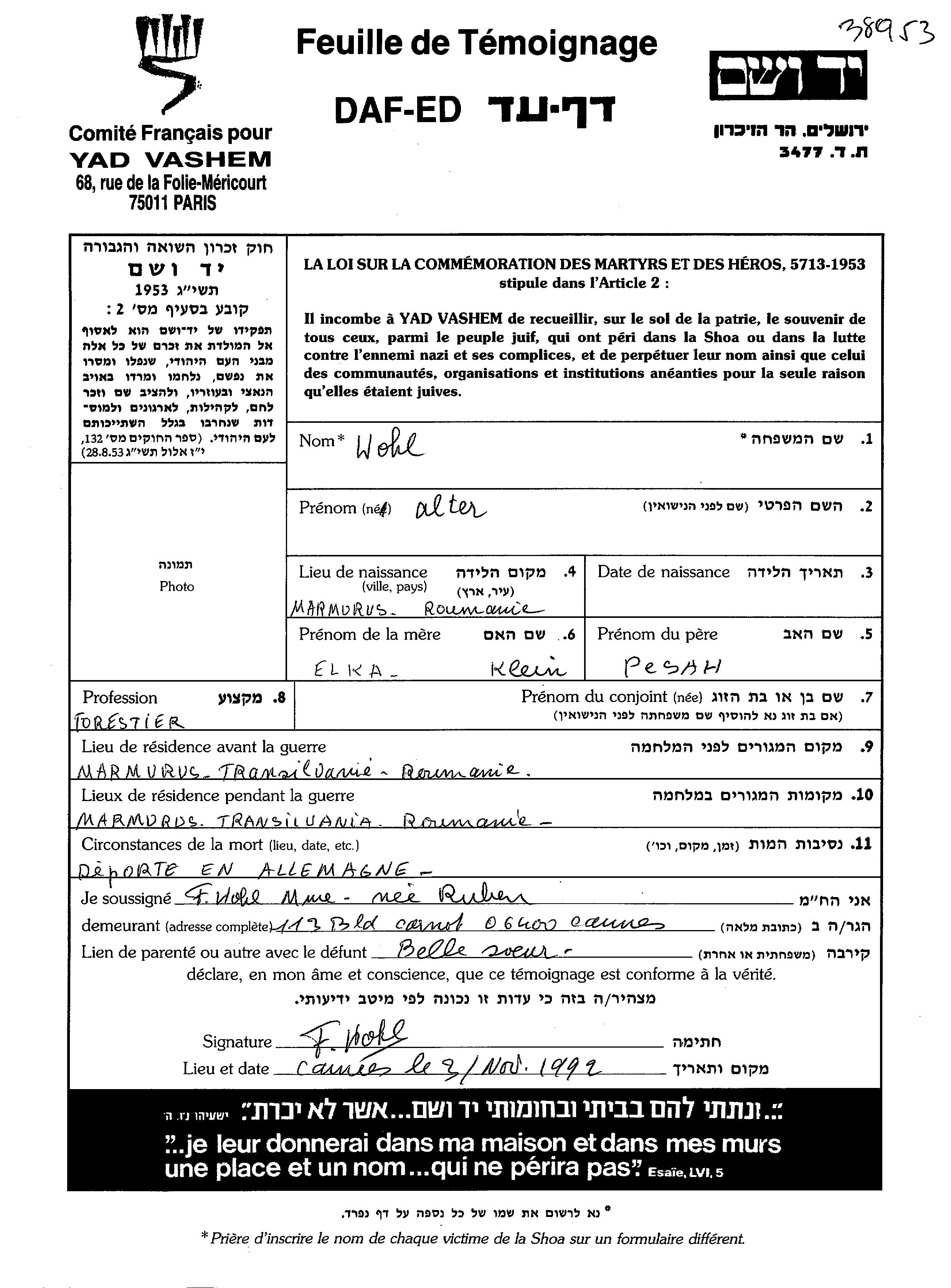 Alter Wohl wurde in Maramarossziget, Rumänien geboren. Er war der Sohn von Pesah und Elka, geb. Klein. Vor dem Zweiten Weltkrieg lebte er in Maramarossziget, Rumänien. Während des Krieges war er in Maramarossziget, Rumänien.