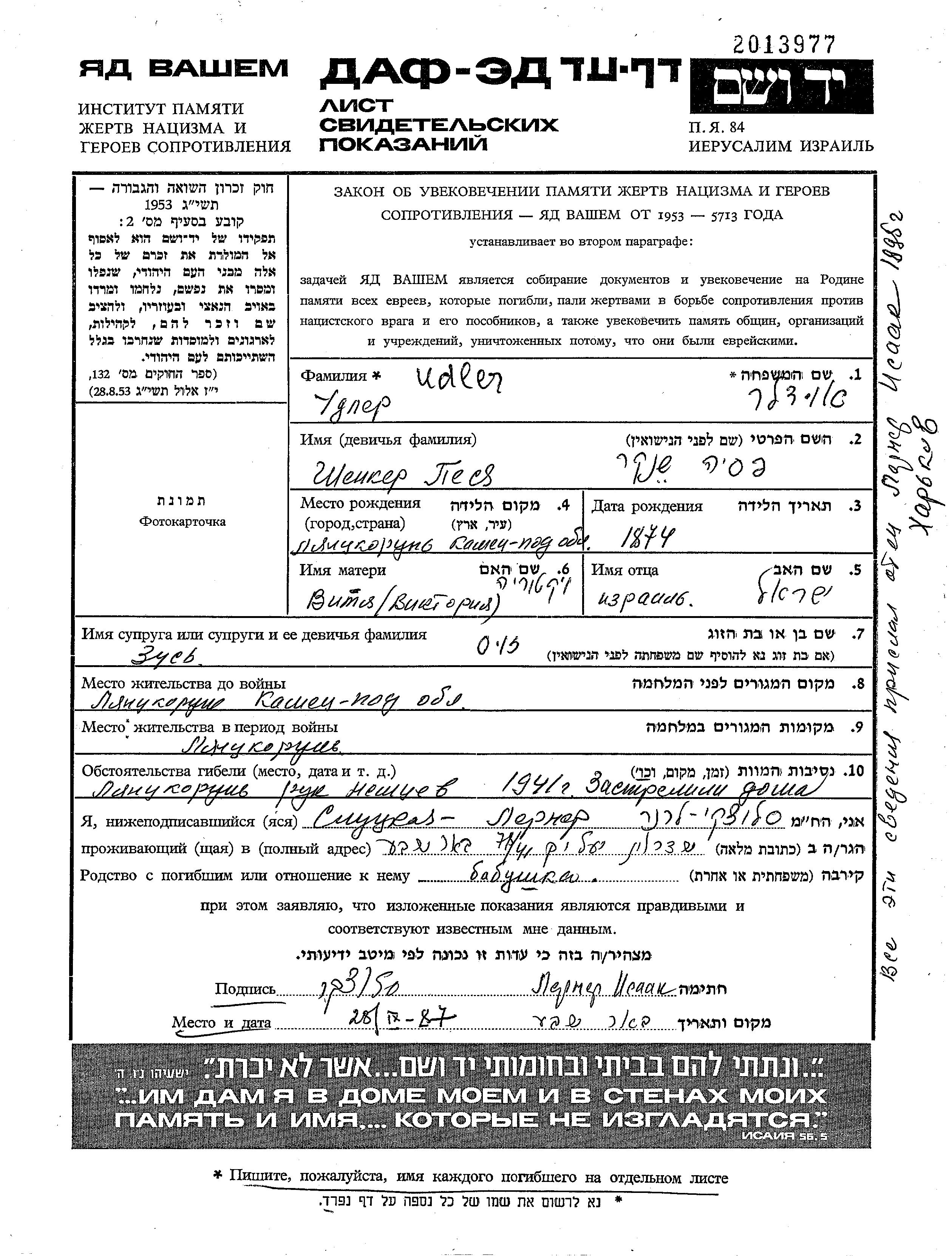 Pesia Udler, geb. Shenker wurde im Jahr 1874 in Laskorun, Ukraine (UdSSR) geboren. Sie war die Tochter von Izrail und Viktoria. Sie war mit Zus Verheiratet. Vor dem Zweiten Weltkrieg lebte sie in Laskorun, Ukraine (UdSSR). Während des Krieges war sie in Laskorun, Ukraine (UdSSR).