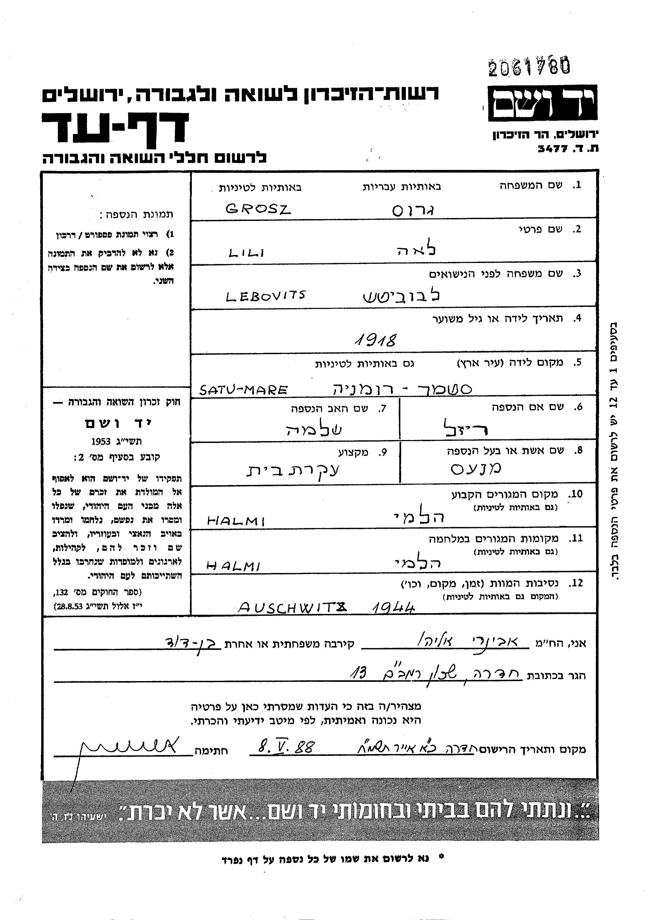 Lili Lea Grosz, geb. Lebovits wurde im Jahr 1918 in Satu Mare, Rumänien geboren. Sie war die Tochter von Shlomo und Raizel. Sie war Hausfrau und mit Manes Verheiratet. Vor dem Zweiten Weltkrieg lebte sie in Halmi, Rumänien. Während des Krieges war sie in Halmeu, Rumänien.