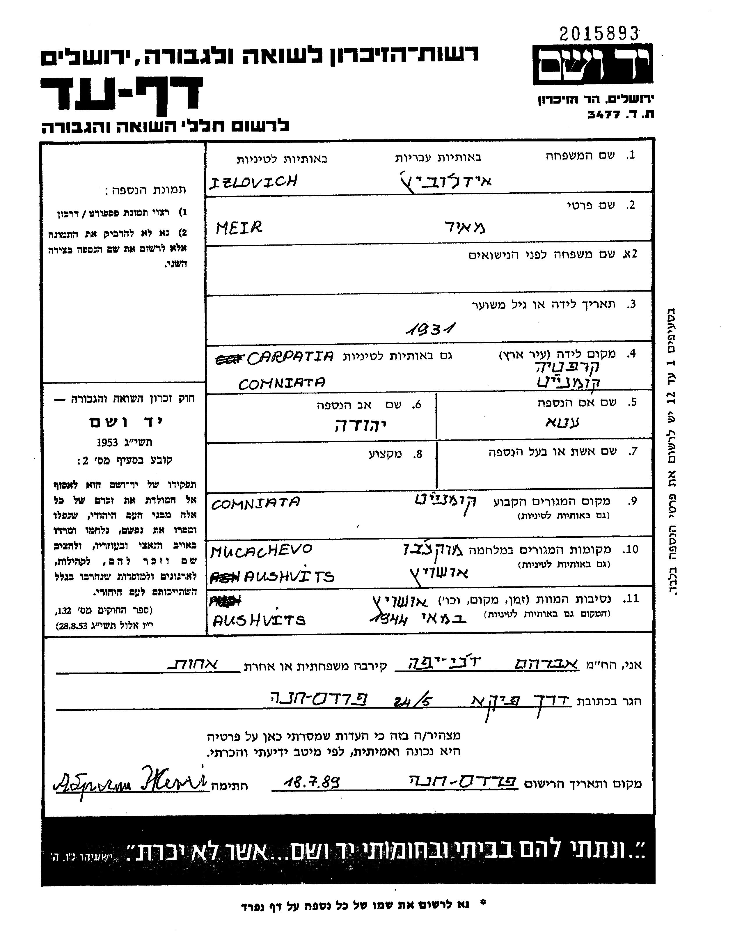 Meir Izlovich Eizelevich wurde im Jahr 1931 in Komniata, Tschechoslowakei geboren. Er war der Sohn von Yehuda und Eti, geb. Sender. Er war Kind. Vor dem Zweiten Weltkrieg lebte er in Komniata, Tschechoslowakei. Während des Krieges war er in Mukacevo, Tschechoslowakei.
