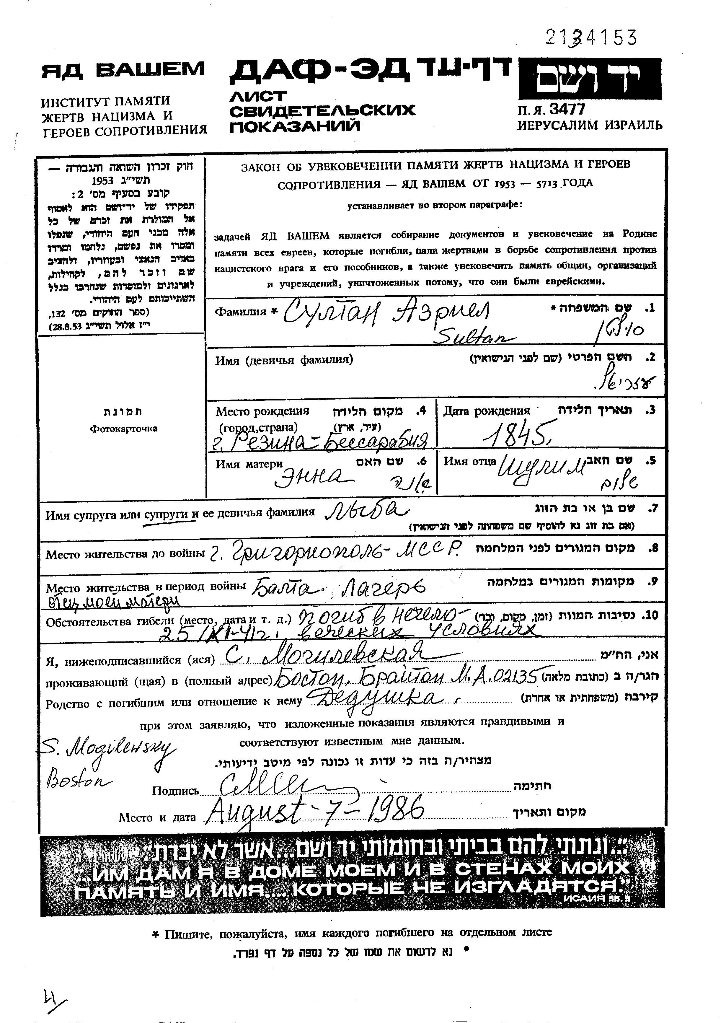 Azriel Sultan wurde in Rezina, Rumänien geboren. Er war der Sohn von Shalom und Ena. Er war mit Lyba Verheiratet. Vor dem Zweiten Weltkrieg lebte er in Grigoriopol, Ukraine (UdSSR). Während des Krieges war er in Balta, Ukraine (UdSSR).