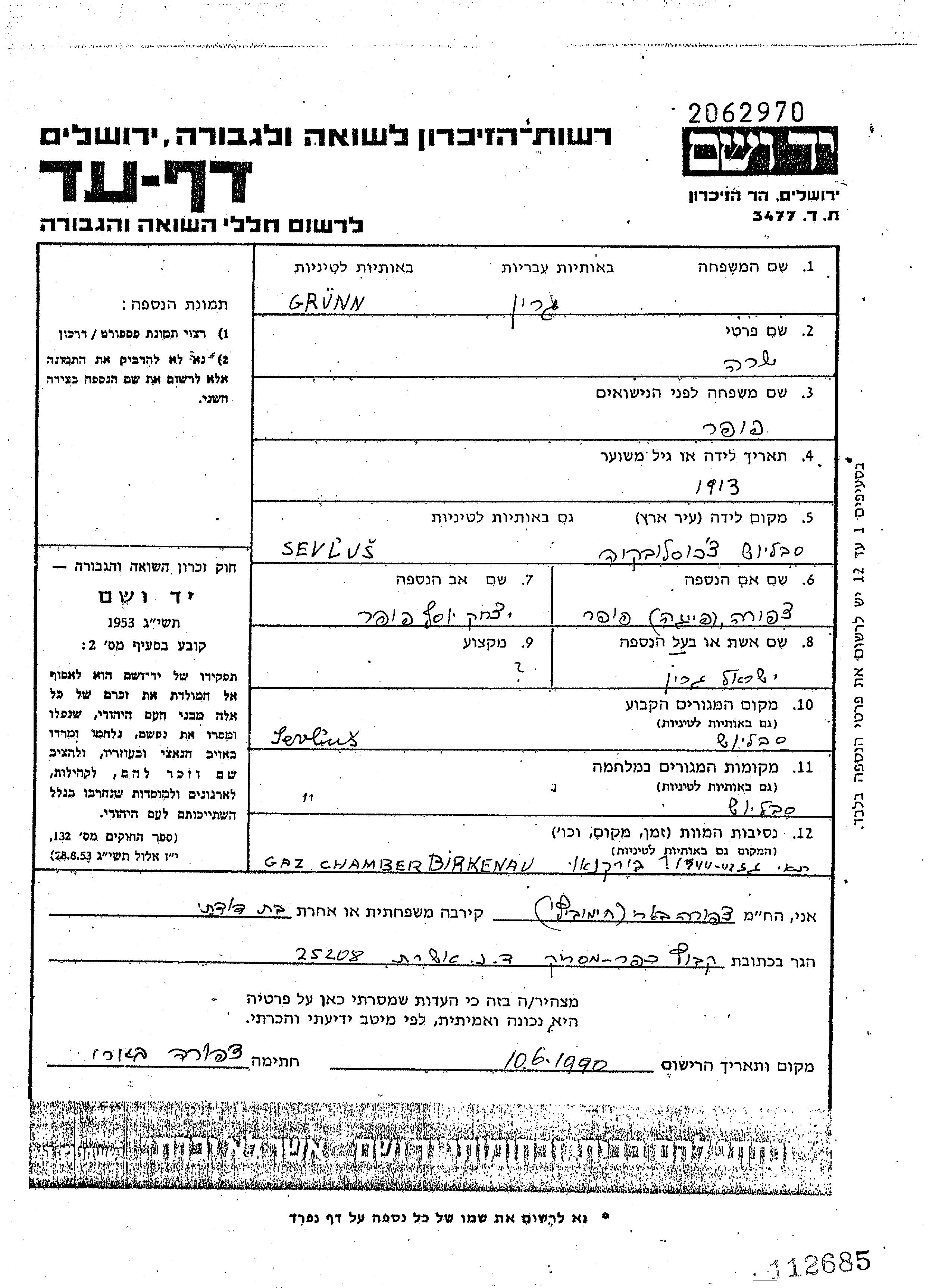 Sara Grünn, geb. Poper wurde im Jahr 1913 in Sevlus, Tschechoslowakei geboren. Sie war die Tochter von Yitzkhak Yosef und Tzipora Feiga. Sie war mit Israel Verheiratet. Vor dem Zweiten Weltkrieg lebte sie in Sevlus, Tschechoslowakei. Während des Krieges war sie in Sevlus, Tschechoslowakei.
