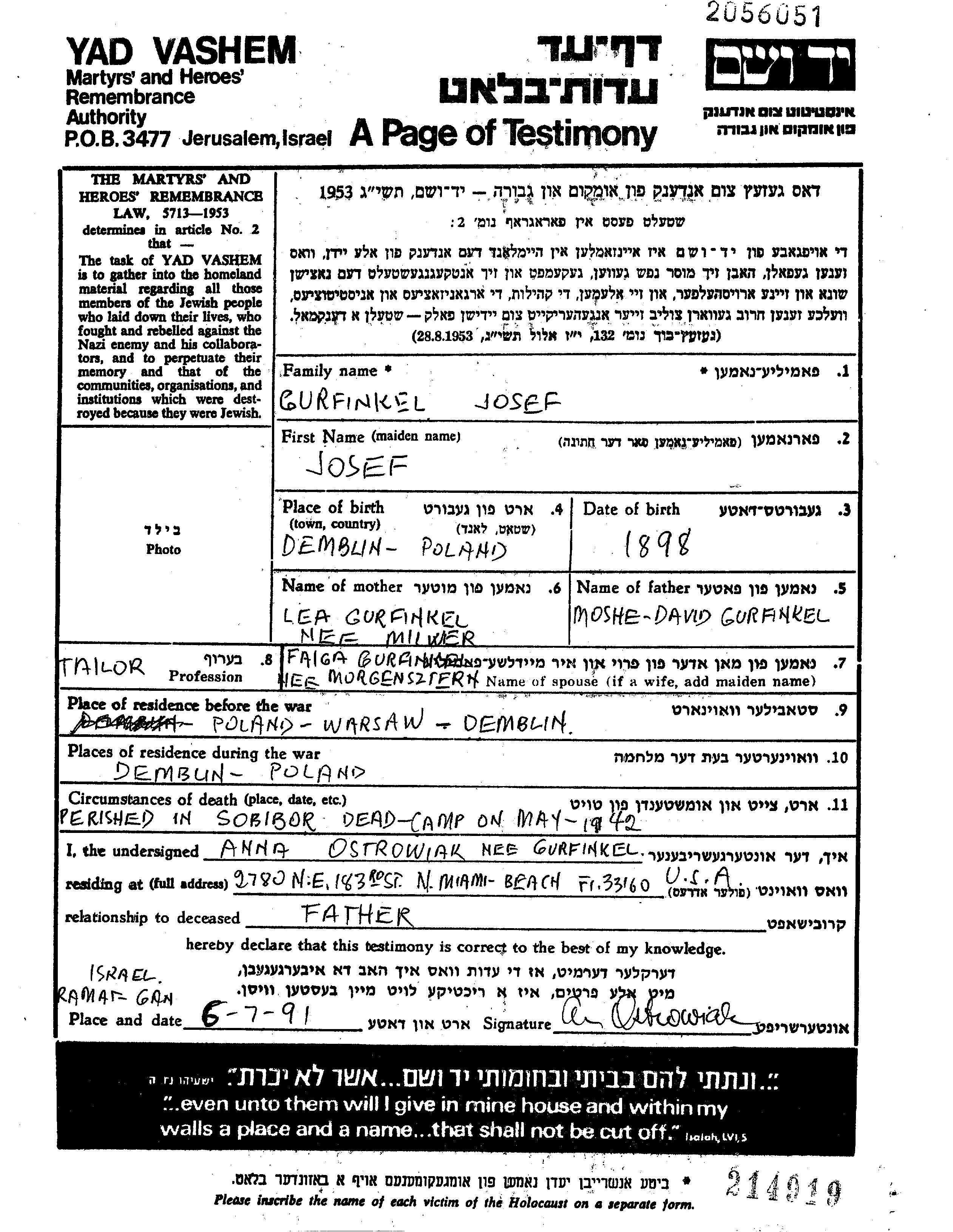 Josef Gurfinkel wurde im Jahr 1898 in Deblin Irena, Polen geboren. Er war der Sohn von Moshe David und Lea, geb. Milwer. Er war Schneider und mit Faiga Verheiratet. Vor dem Zweiten Weltkrieg lebte er in Deblin Irena, Polen. Während des Krieges war er in Deblin Irena, Polen.