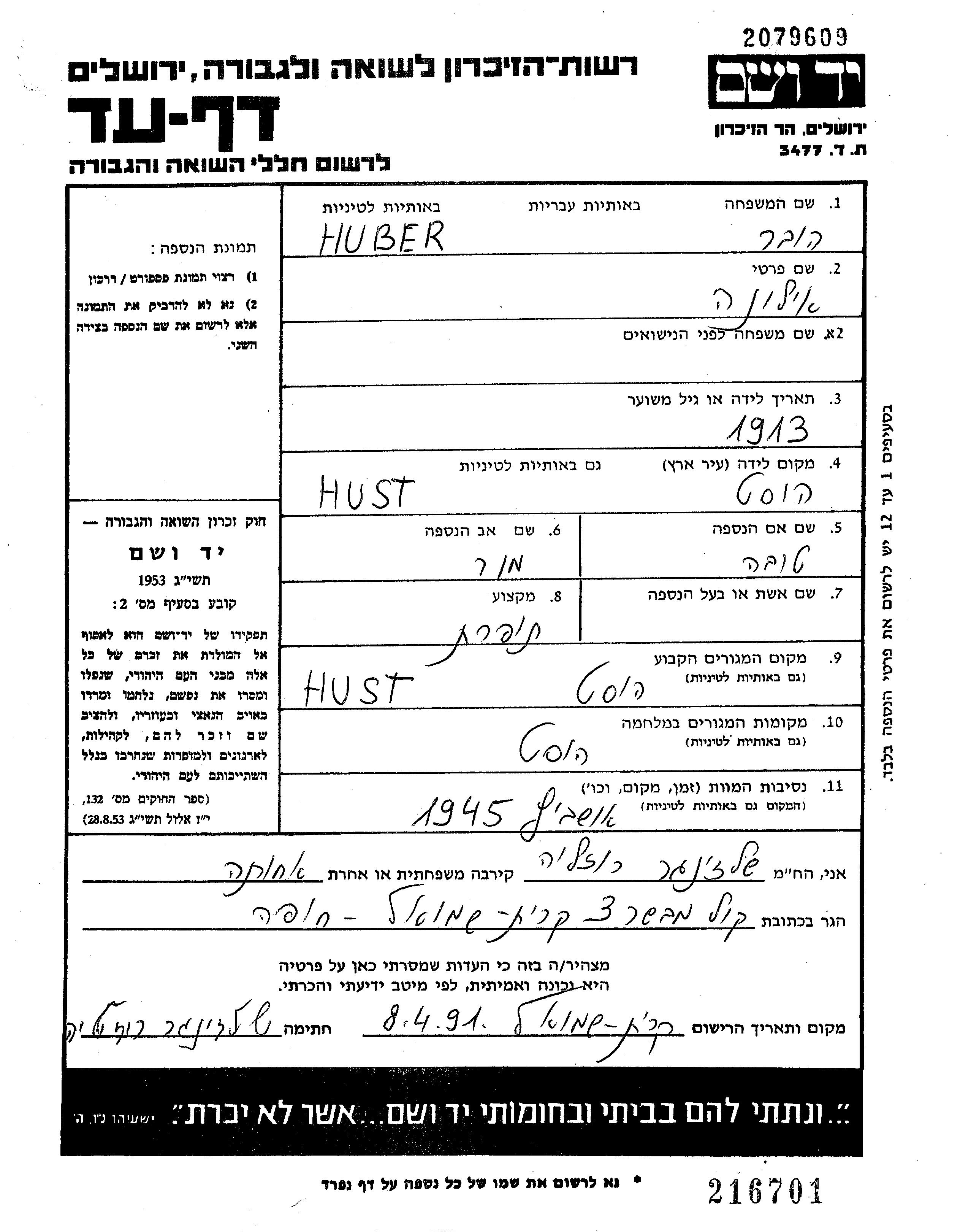 Ilona Huber wurde in Hust, Tschechoslowakei geboren. Sie war die Tochter von Mor und Tova, geb. Rozenberg. Sie war Schneiderin. Vor dem Zweiten Weltkrieg lebte sie in Hust, Tschechoslowakei. Während des Krieges war sie in Hust, Tschechoslowakei.