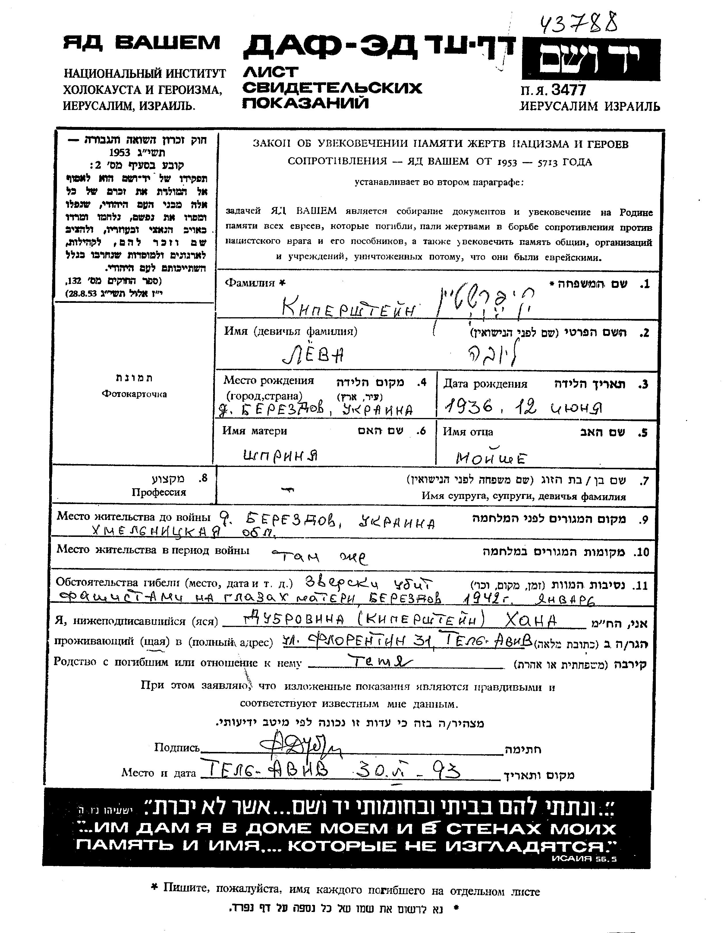 Kipershtein Liuba 1936 Berezdov, Ukraine (UdSSR) Gedenkblatt