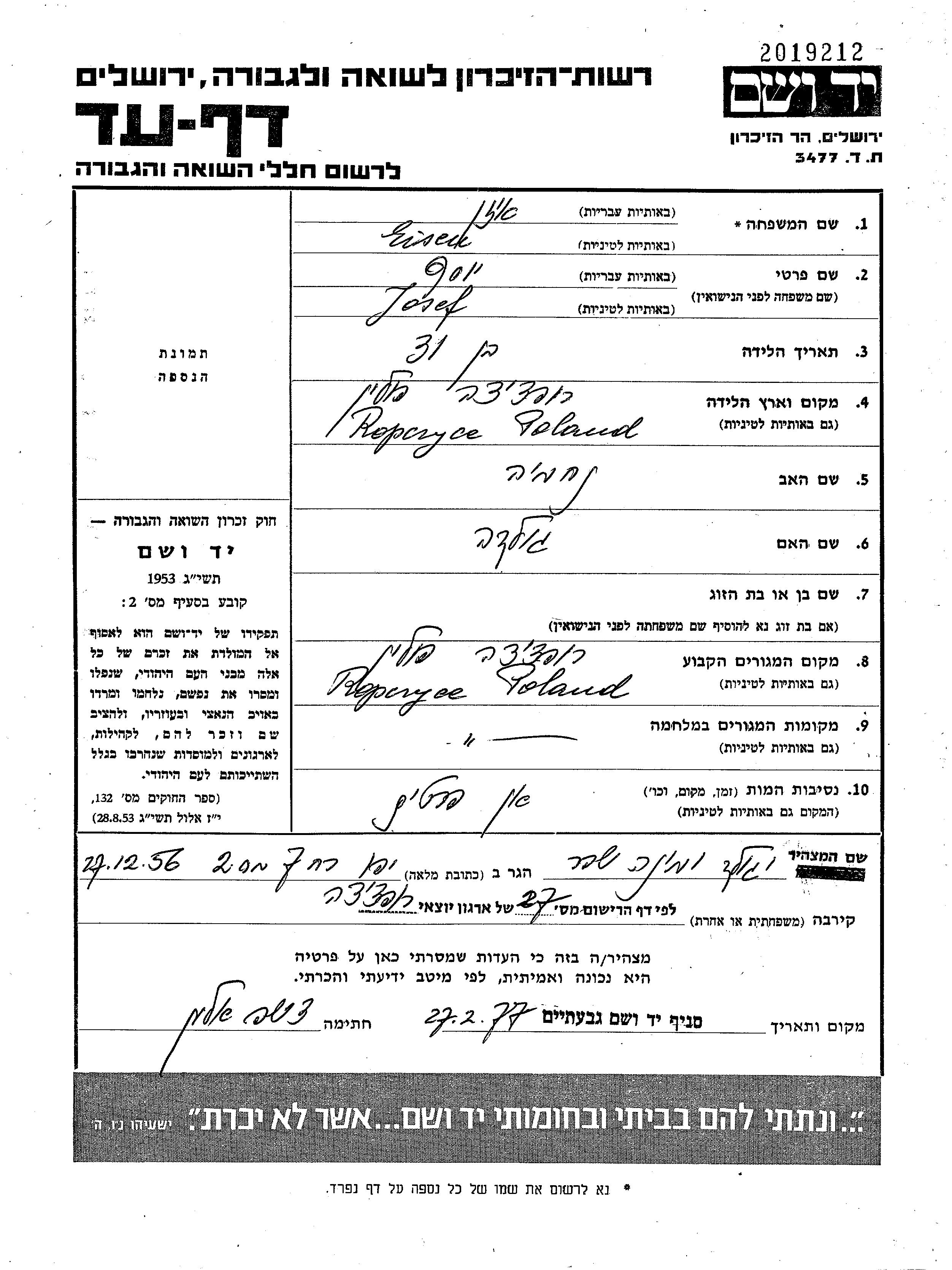 Josef Eizen wurde in Ropczyce, Polen geboren. Er war der Sohn von Nekhemia und Golda. Vor dem Zweiten Weltkrieg lebte er in Ropczyce, Polen. Während des Krieges war er in Ropczyce, Polen.