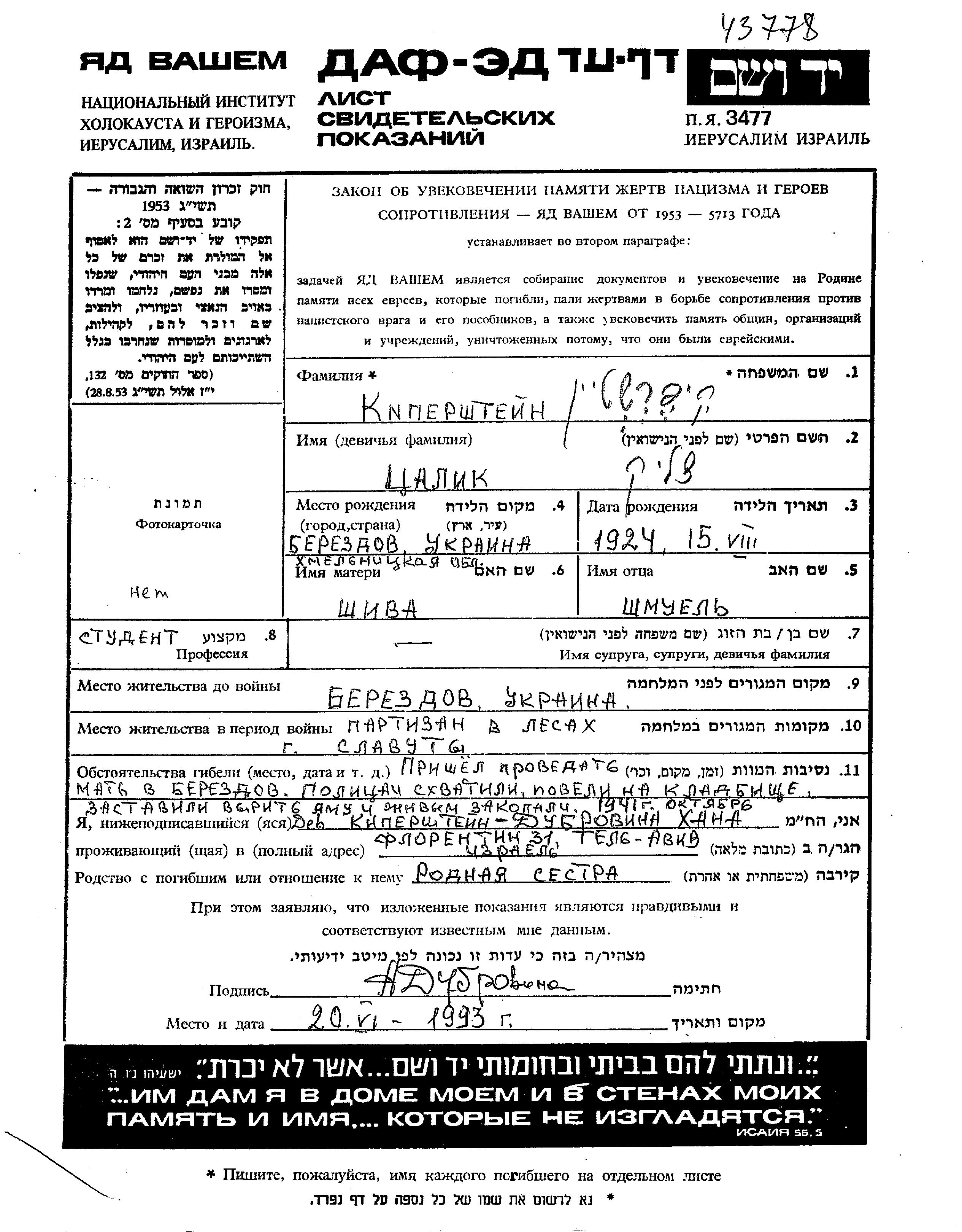 Betzalel Kipershtein wurde im Jahr 1924 in Berezdov, Ukraine (UdSSR) geboren. Er war der Sohn von Shmuel und Batsheva, geb. Keizerman. Er war Student und Kind. Vor dem Zweiten Weltkrieg lebte er in Berezdov, Ukraine (UdSSR). Während des Krieges war er in Berezdov, Ukraine (UdSSR).