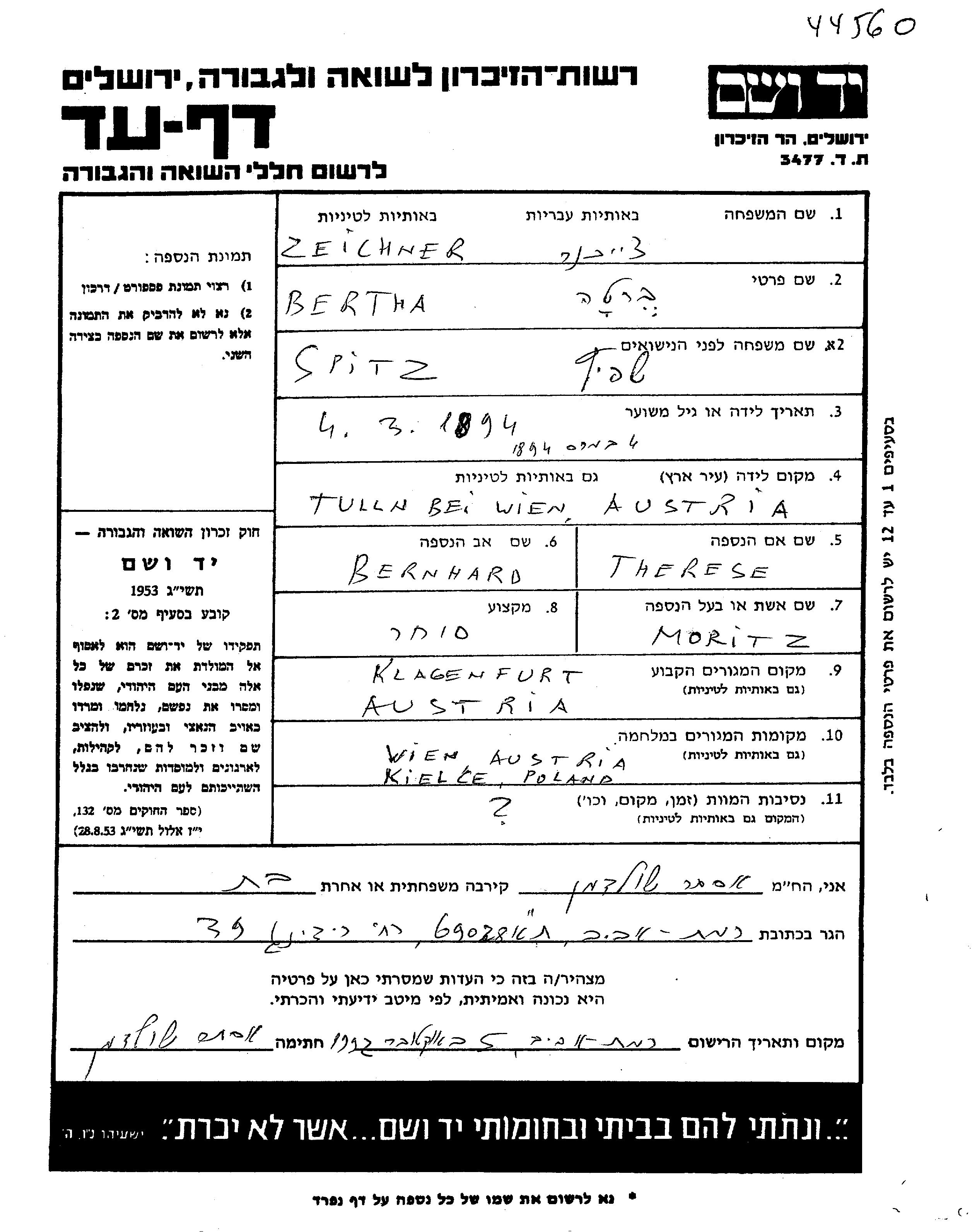 Bertha Zeichner, geb. Spitz wurde im Jahr 1894 in Tulln, Österreich geboren. Sie war die Tochter von Bernhard und Therese. Sie war mit Moritz Verheiratet. Vor dem Zweiten Weltkrieg lebte sie in Klagenfurt, Österreich. Während des Krieges war sie in Kielce, Polen.