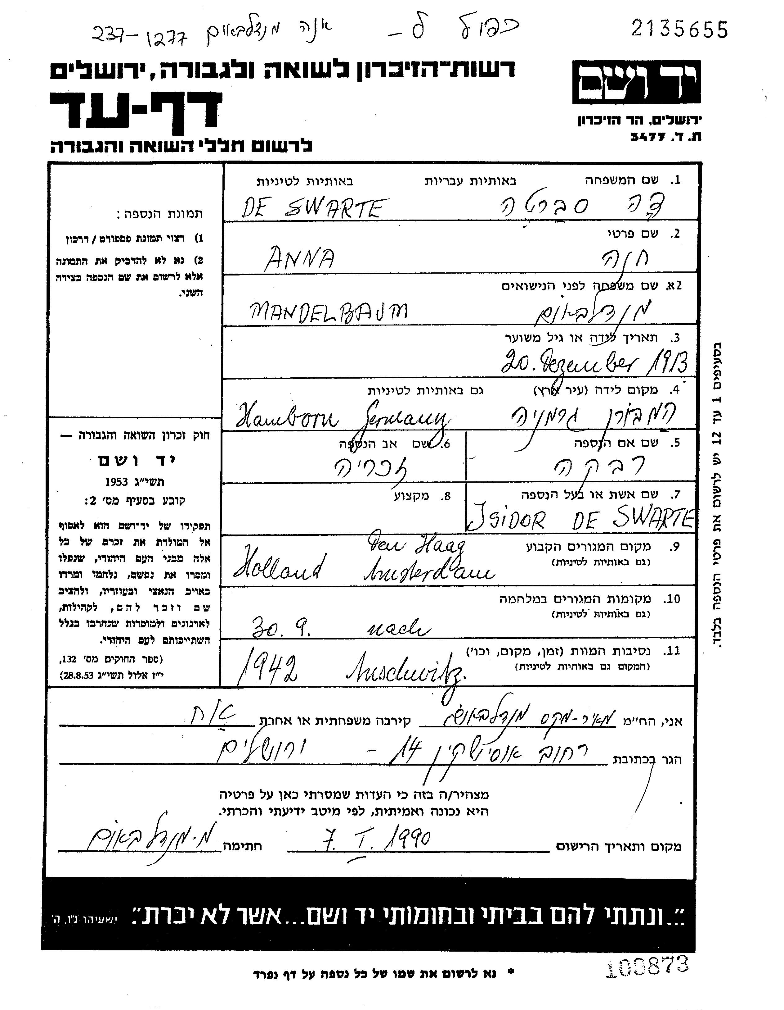 Anna Khana Swarte de, geb. Mandelbaum wurde im Jahr 1913 in Hamburg, Deutsches Reich geboren. Sie war die Tochter von Zakharia und Rivka. Sie war mit Isidor Verheiratet. Vor dem Zweiten Weltkrieg lebte sie in Den Haag, Niederlande. Während des Krieges war sie in Amsterdam, Niederlande.