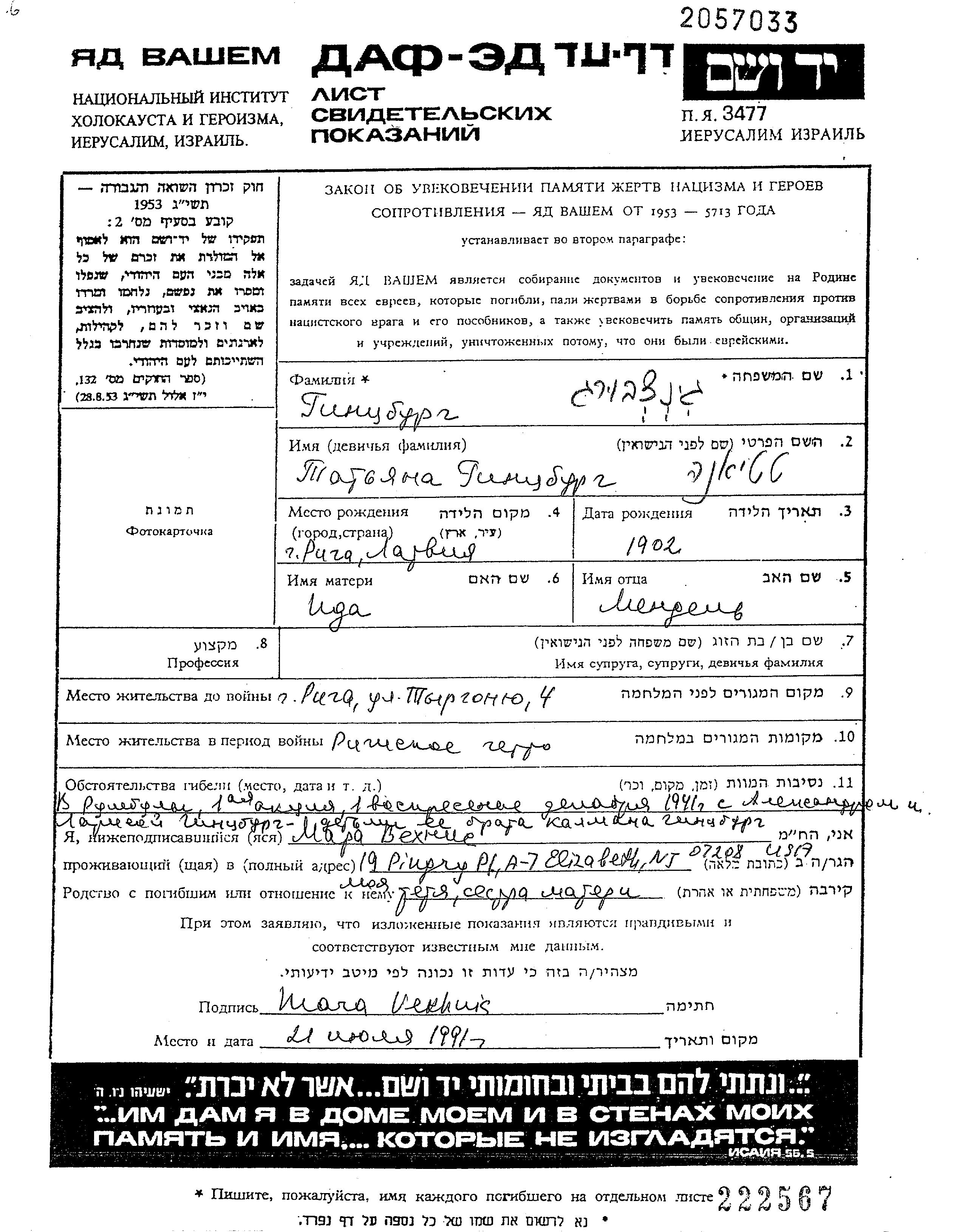 Tatiana wurde in der Schoah ermordet. Todesort: Rumbuli, Lettland im Jahr 07/12/1941.