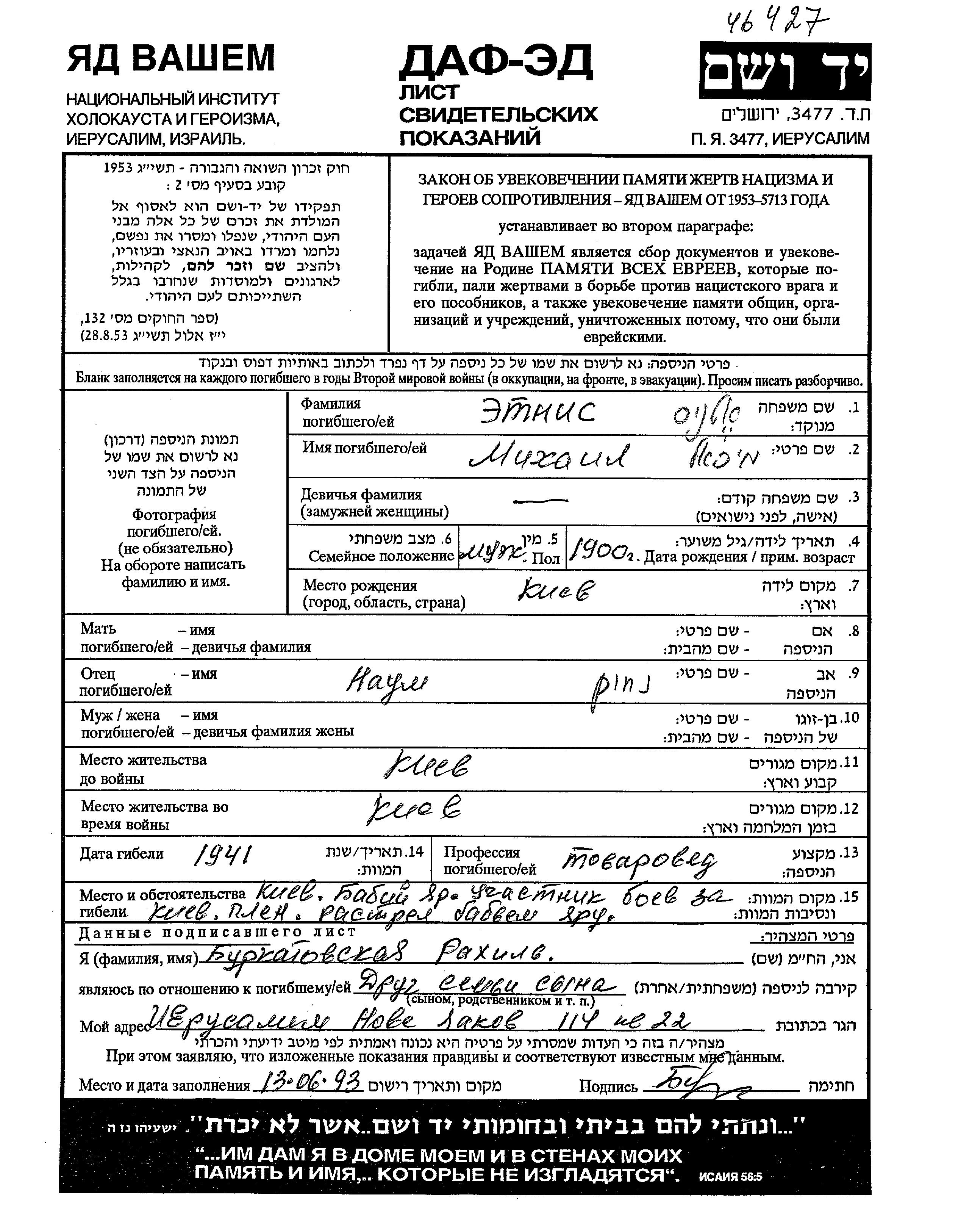 Mikhail Etnis wurde im Jahr 1900 in Kiyev, Ukraine (UdSSR) geboren. Er war der Sohn von Nakhum. Er war Lieferant. Vor dem Zweiten Weltkrieg lebte er in Kiyev, Ukraine (UdSSR). Während des Krieges war er in Kiyev, Ukraine (UdSSR).