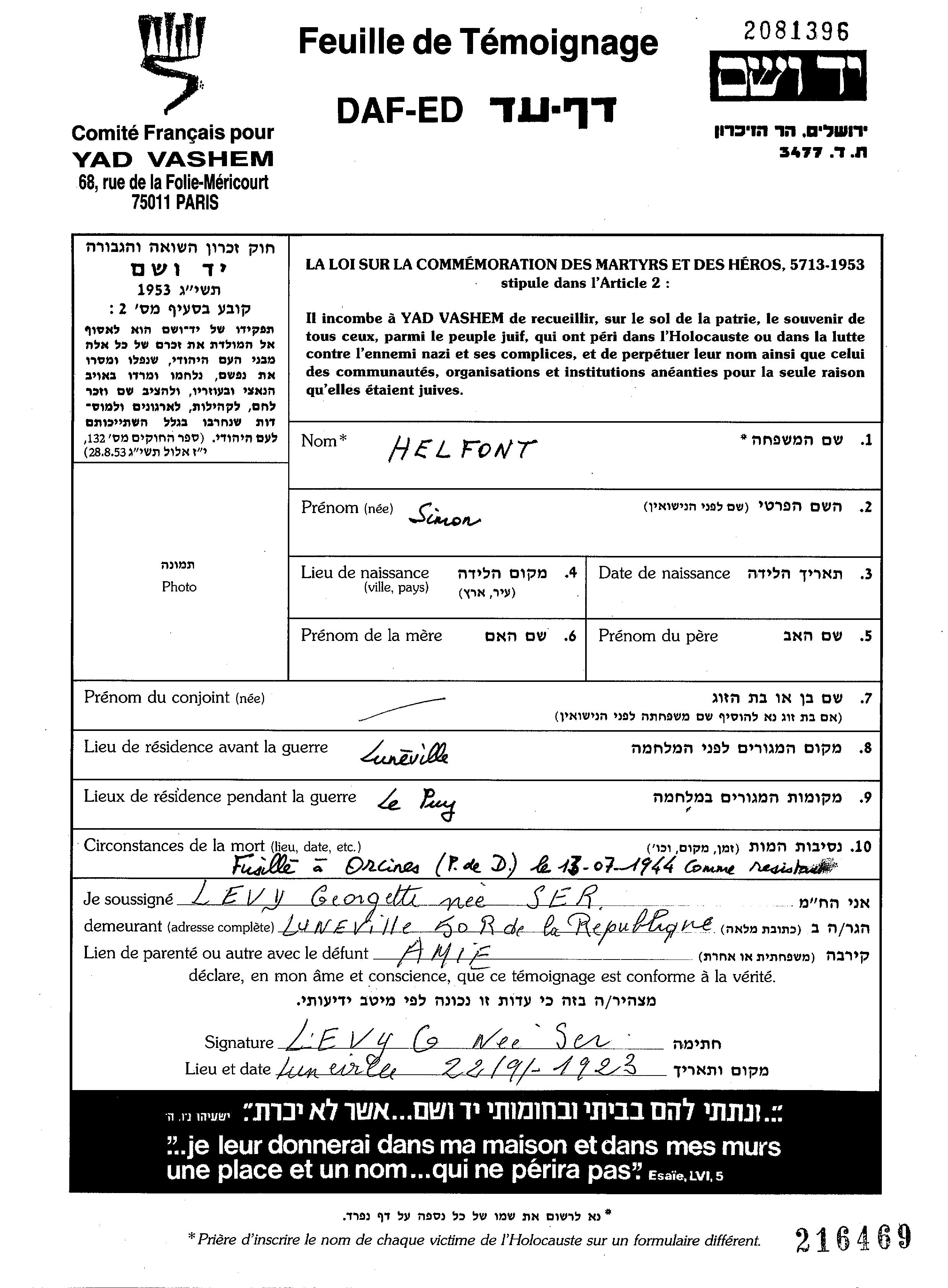 Simon Helfont. Vor dem Zweiten Weltkrieg lebte er in Luneville, Frankreich. Während des Krieges war er in Le Puy en Velay, Frankreich.