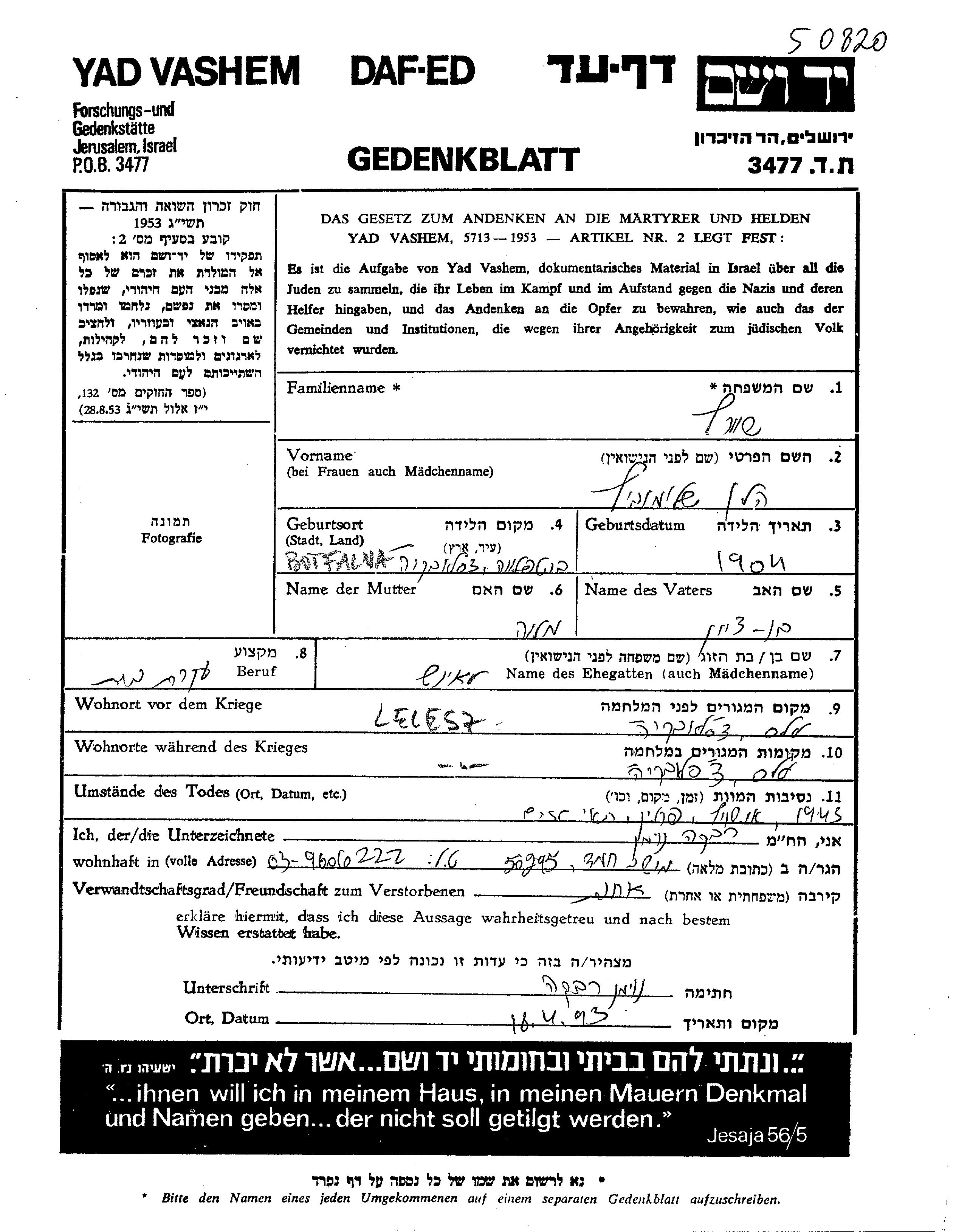 Helen Shvartz, geb. Shlomovich wurde im Jahr 1904 in Botfalva, Tschechoslowakei geboren. Sie war die Tochter von Bentzion und Malia, geb. Vaiman. Sie war Hausfrau und mit Laiosh Verheiratet. Vor dem Zweiten Weltkrieg lebte sie in Lelesz, Tschechoslowakei. Während des Krieges war sie in Lelesz, Tschechoslowakei.
