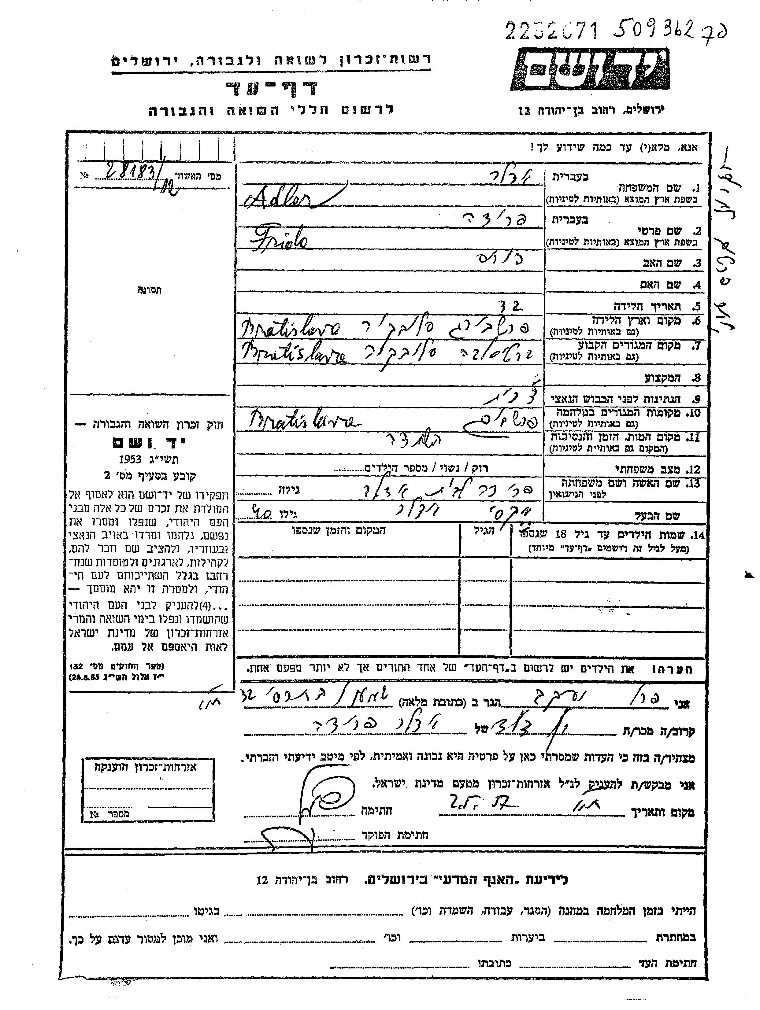 Frida Adler, geb. Adler wurde in Bratislava, Tschechoslowakei geboren. Sie war die Tochter von Pinkhas. Sie war mit Meksi Verheiratet. Vor dem Zweiten Weltkrieg lebte sie in Bratislava, Tschechoslowakei. Während des Krieges war sie in Bratislava, Tschechoslowakei.
