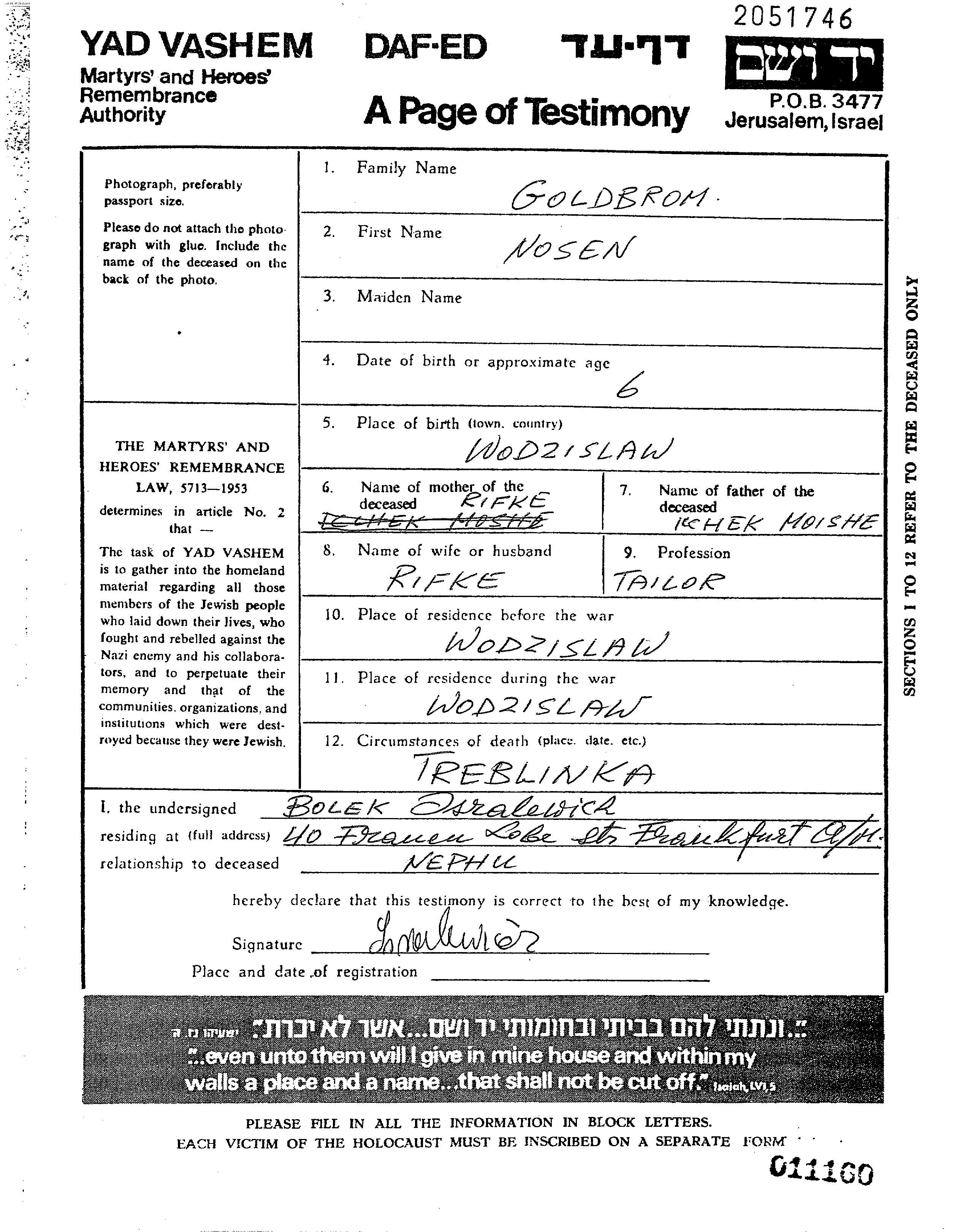 Nosen Goldbrom wurde in Wodzislaw, Polen geboren. Er war der Sohn von Icchek Moishe und Rifke. Er war Kind. Vor dem Zweiten Weltkrieg lebte er in Wodzislaw, Polen. Während des Krieges war er in Wodzislaw, Polen.